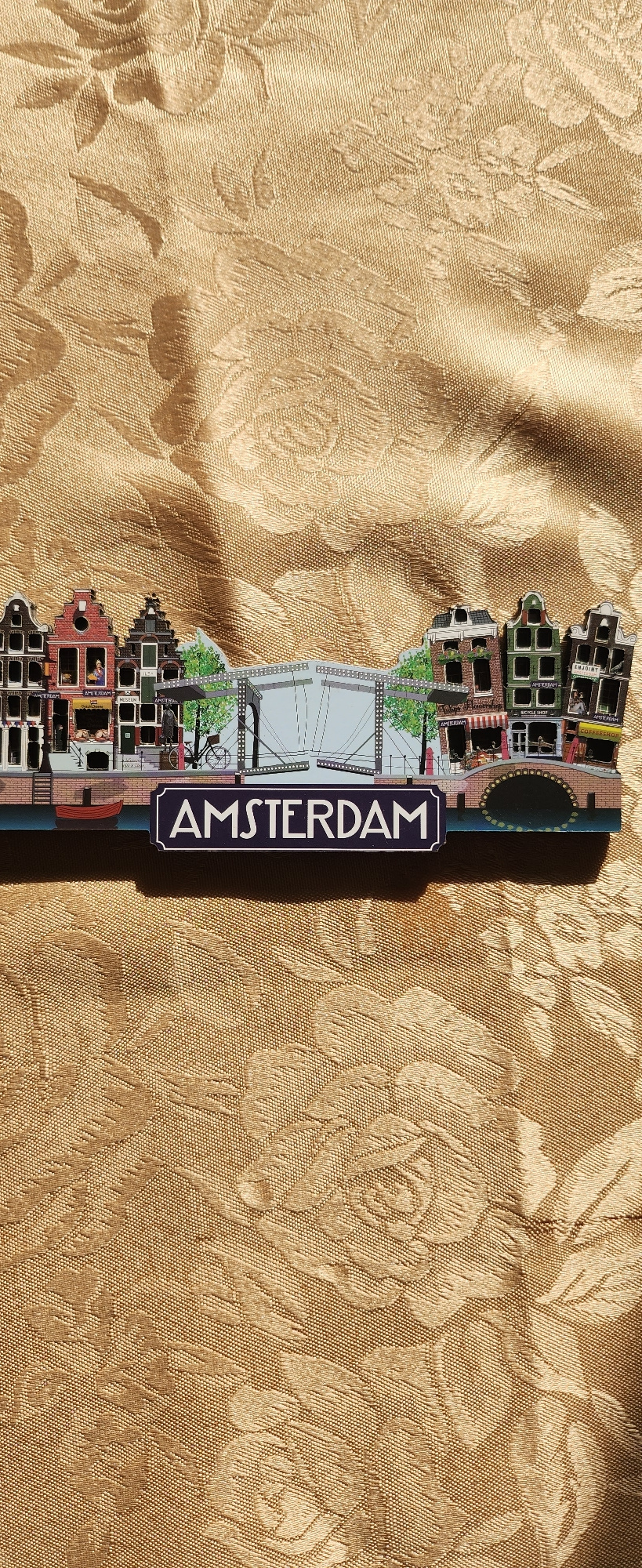 The image shows a souvenir depicting a canal scene in Amsterdam, Netherlands, placed on a golden floral-patterned surface. The souvenir includes miniature buildings, a bridge, and a sign with the word…read more