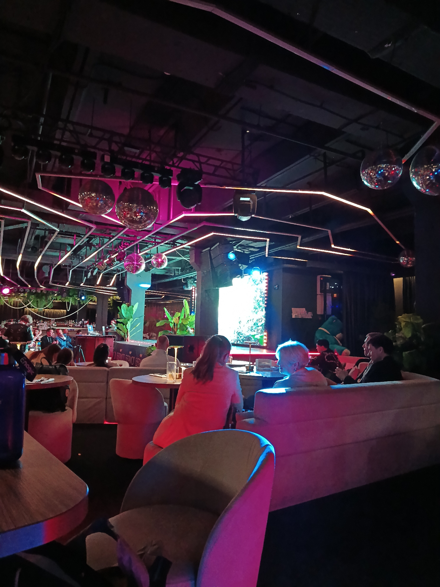 The image captures a scene inside what appears to be a lounge or nightclub, possibly in Moscow, Russia, as indicated by prior knowledge. The interior is dimly lit, illuminated by ambient lighting from…read more