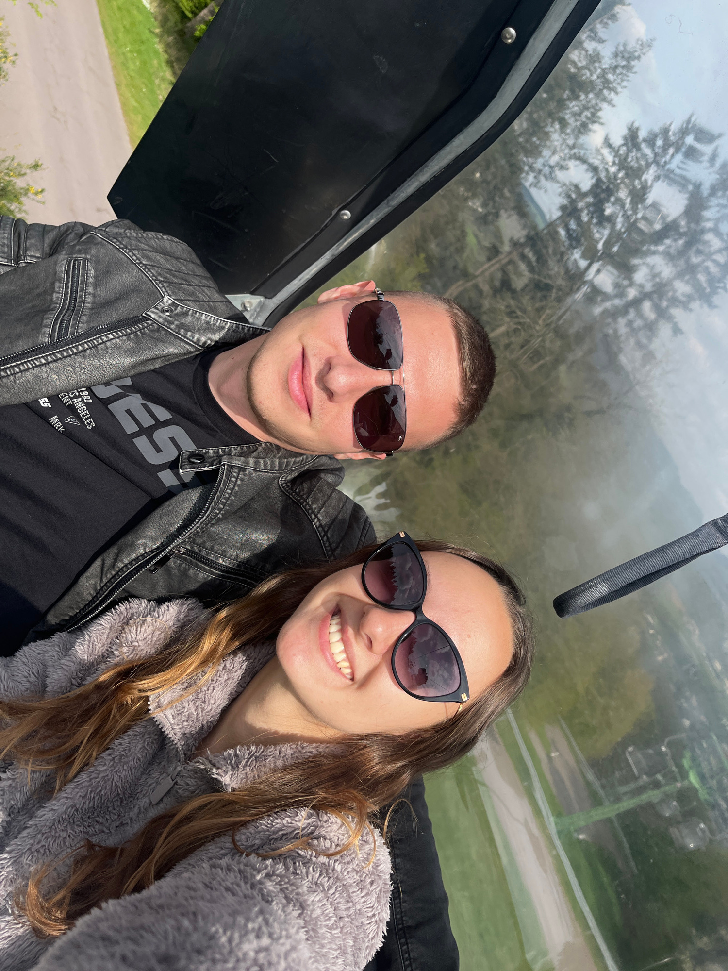 A selfie shows a Caucasian male and female inside a cable car with a clear dome. The man, left, is wearing a black Guess t-shirt and a gray leather jacket, along with sunglasses. The woman, right, is…read more