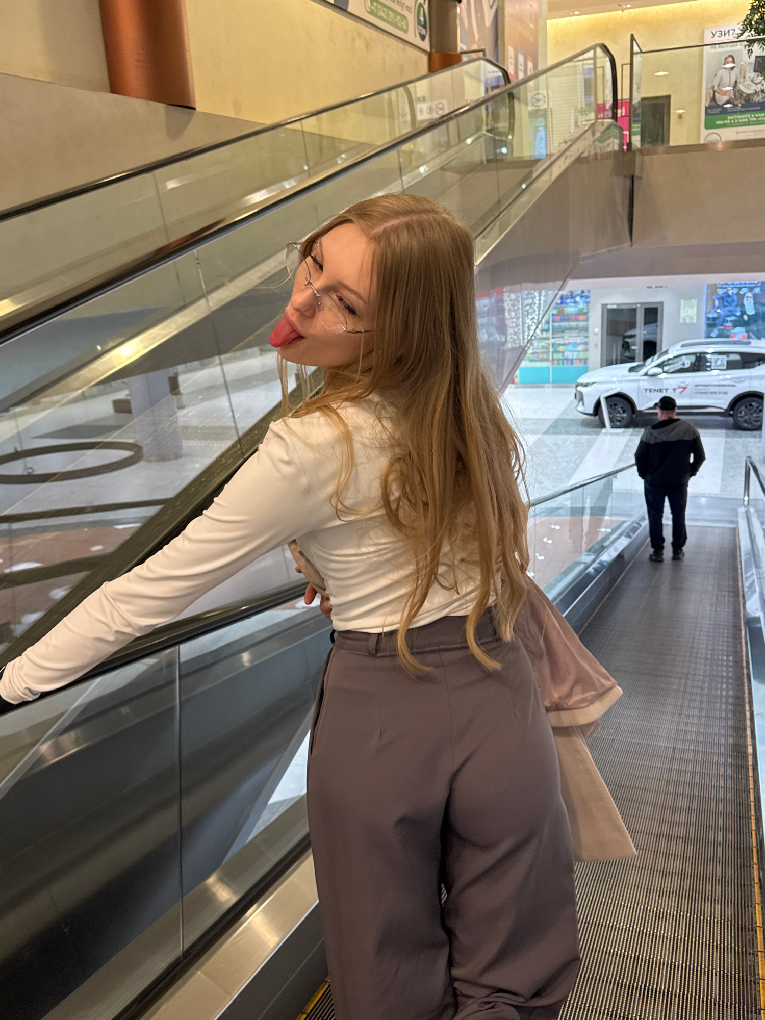 A fair-skinned woman with blonde hair and glasses is standing on an escalator indoors in Perm, Russia. She is sticking her tongue out. She is wearing a long-sleeved white shirt and brown pants. A pers…read more