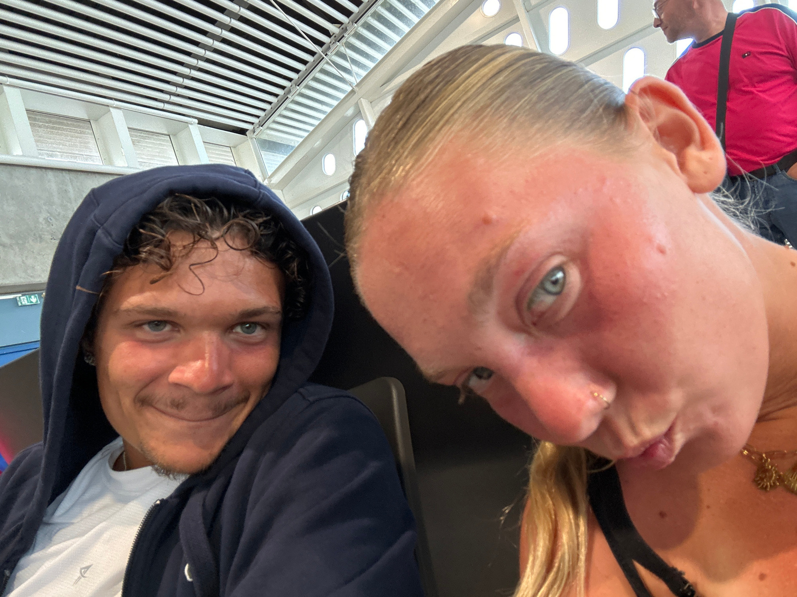 Two individuals are featured prominently in a selfie-style photograph. On the left, a young male with curly brown hair is wearing a navy blue hooded sweatshirt over a white t-shirt. He has light eyes…read more