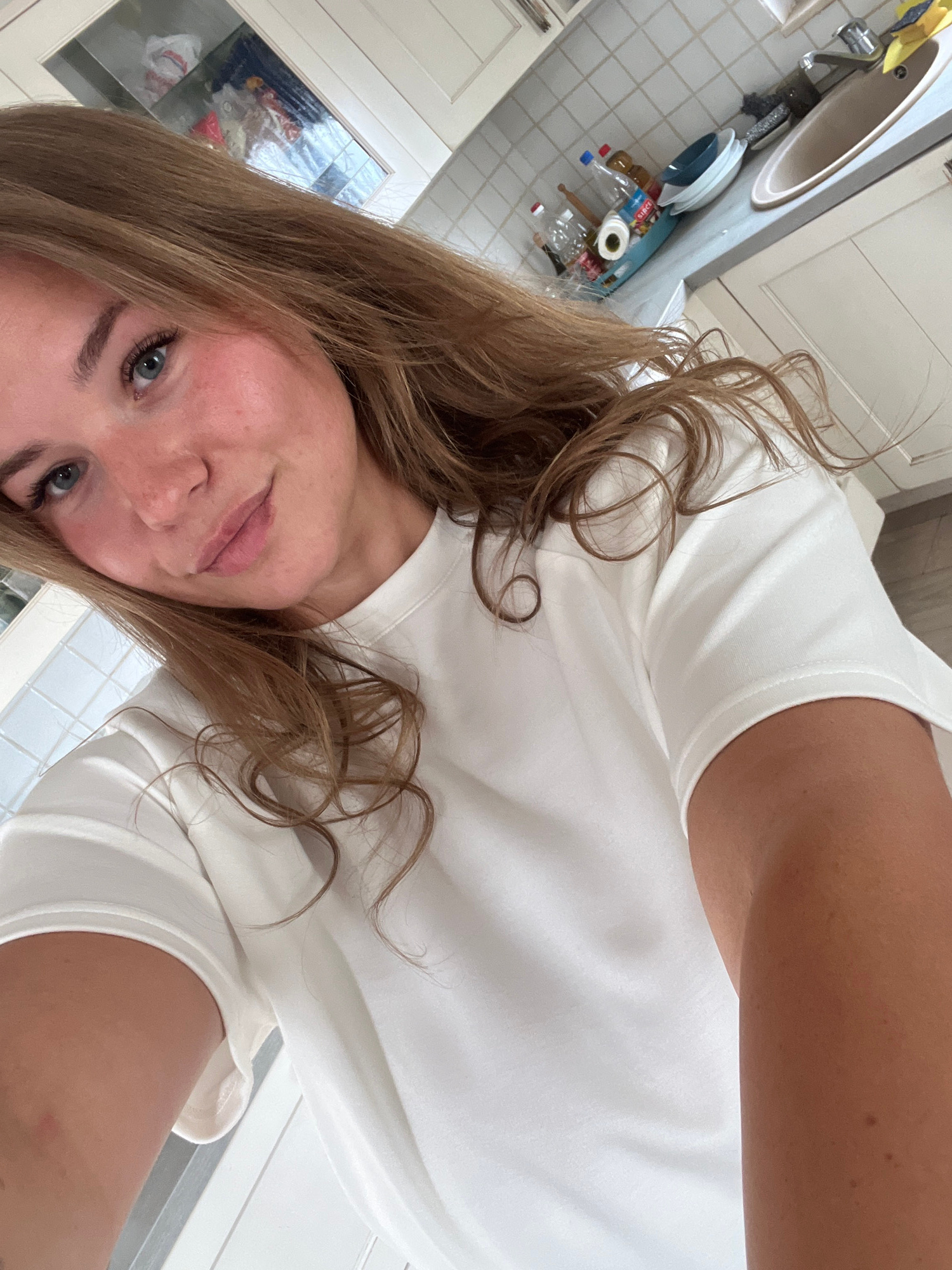 A woman with light brown hair and blue eyes, wearing a white t-shirt, is positioned in a kitchen. Visible elements include a white sink, cabinet, tile backsplash, and dish soap. The location is indica…read more