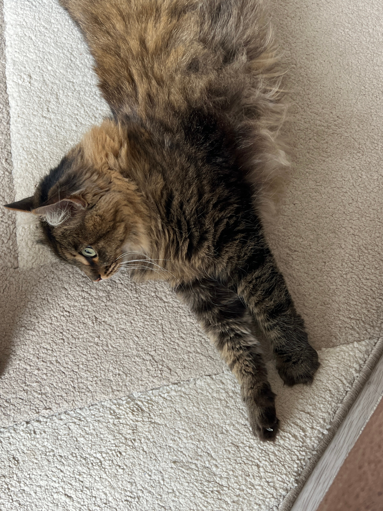A long-haired brown tabby cat is lying on its back on a light beige carpet. The cat is stretched out diagonally across the frame, with its head near the lower left corner and its extended front paw ne…read more