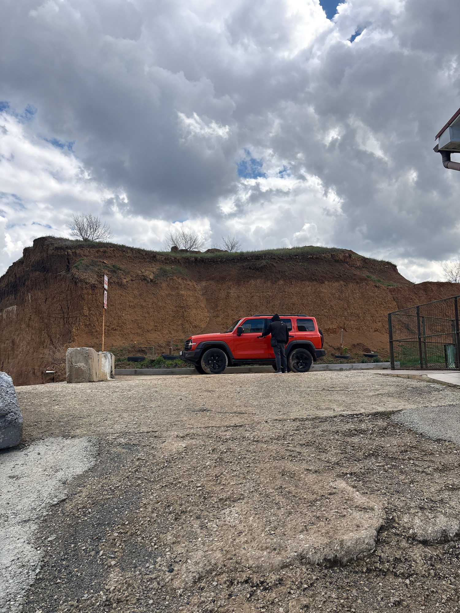 The image depicts an orange Jeep parked on a concrete surface near the edge of a cliff or steep embankment. A person wearing dark clothing is standing next to the driver's side door. The cliff is comp…read more