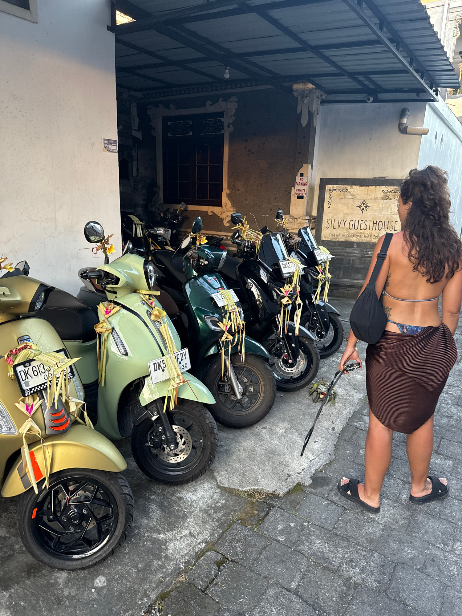 The image captures a partial view of a street in Canggu, Indonesia. The main subject is a row of parked motorbikes, adorned with traditional Balinese offerings, including woven palm leaves and small f…read more