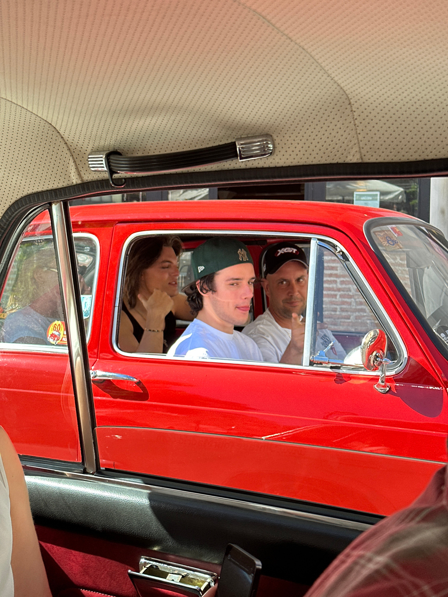 The image depicts the interior of a red vintage car, possibly in Madrid, Spain, due to the presence of a sticker suggesting a possible connection to the city. Three individuals are visible: two malesβ¦read more