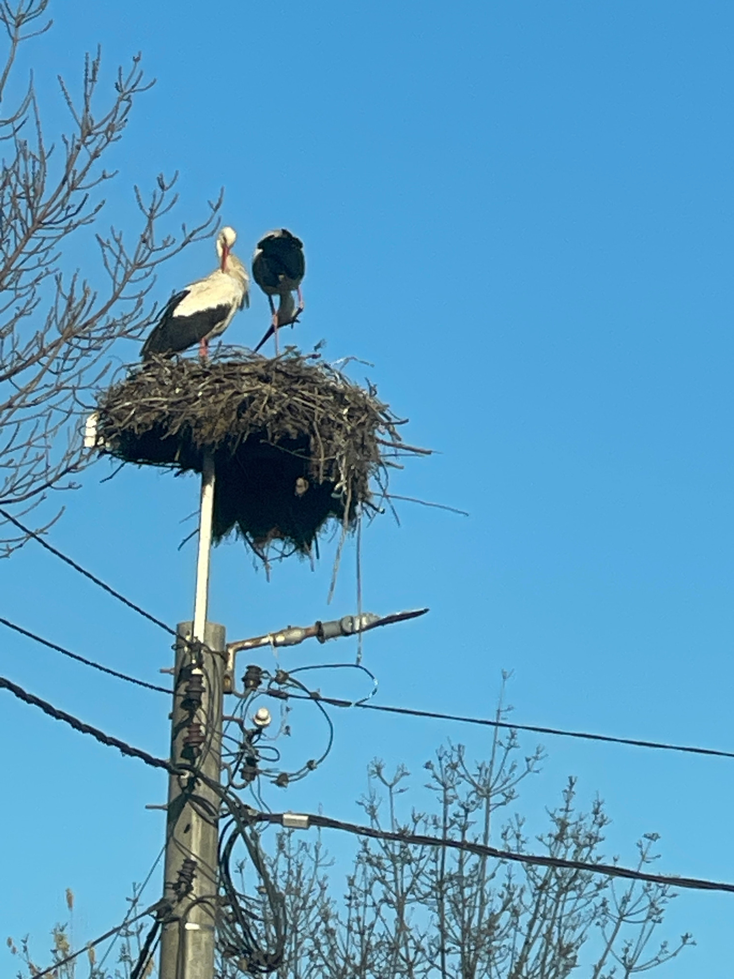 Two storks, one primarily white with black wings and a red beak, and the other primarily black with a lighter beak, are perched near a large nest. The nest, constructed of twigs and various debris, si…read more