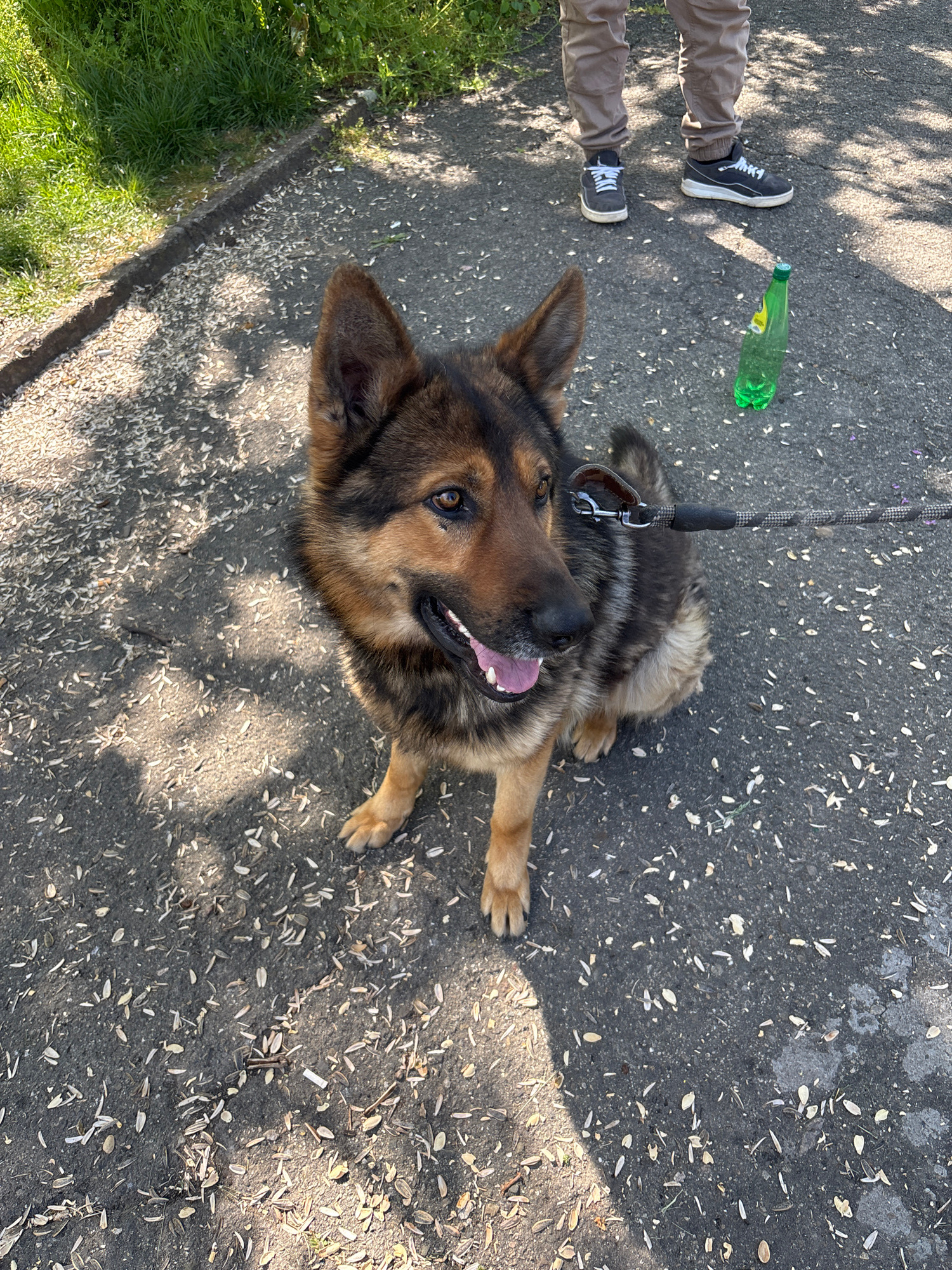 A vibrant, high-angle outdoor shot captures a large, medium-haired dog, resembling a German Shepherd with brown, black, and tan fur, sitting on a paved path. The dog is looking directly upwards with a…read more