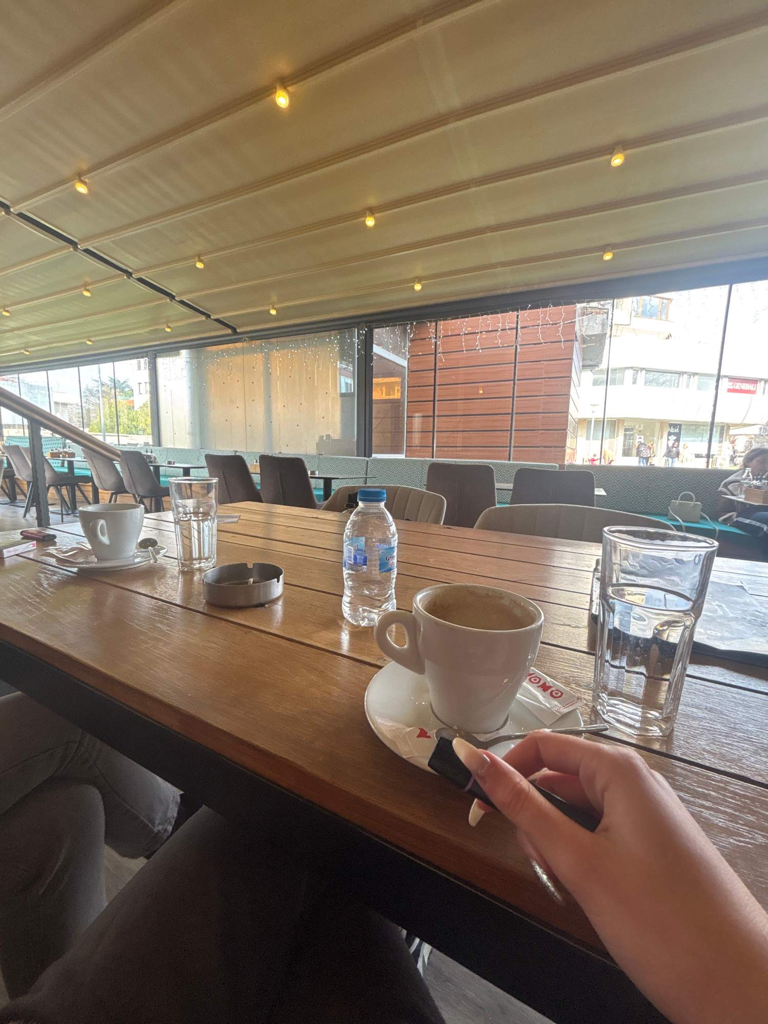 The image shows a table at an outdoor cafe. On the table, there is a glass of water, an empty coffee cup on a saucer, a sugar packet, a bottle of water, and an ashtray. A person's hand is holding a su…read more
