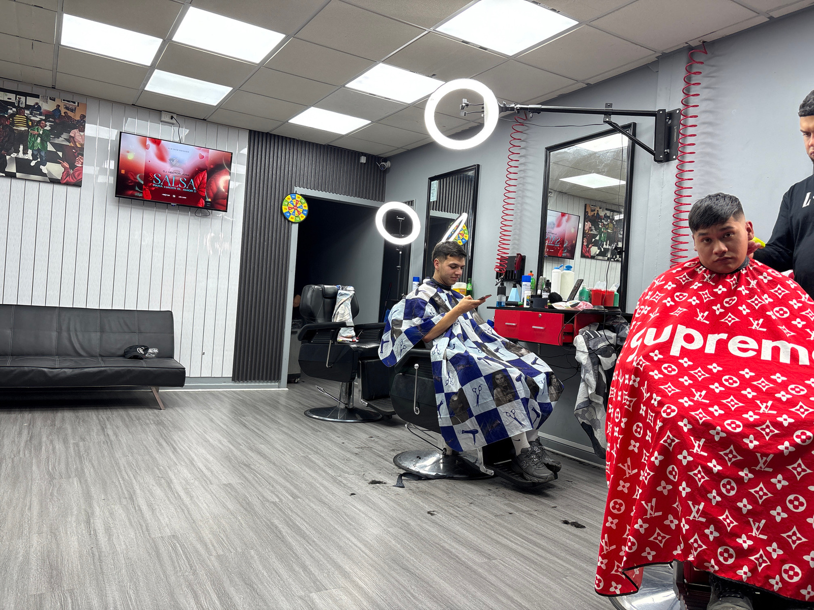 The image depicts the interior of a barbershop. Two customers are present, one in a chair getting a haircut, covered with a red and white "Supreme" branded cape, and the other sitting in a barber's ch…read more