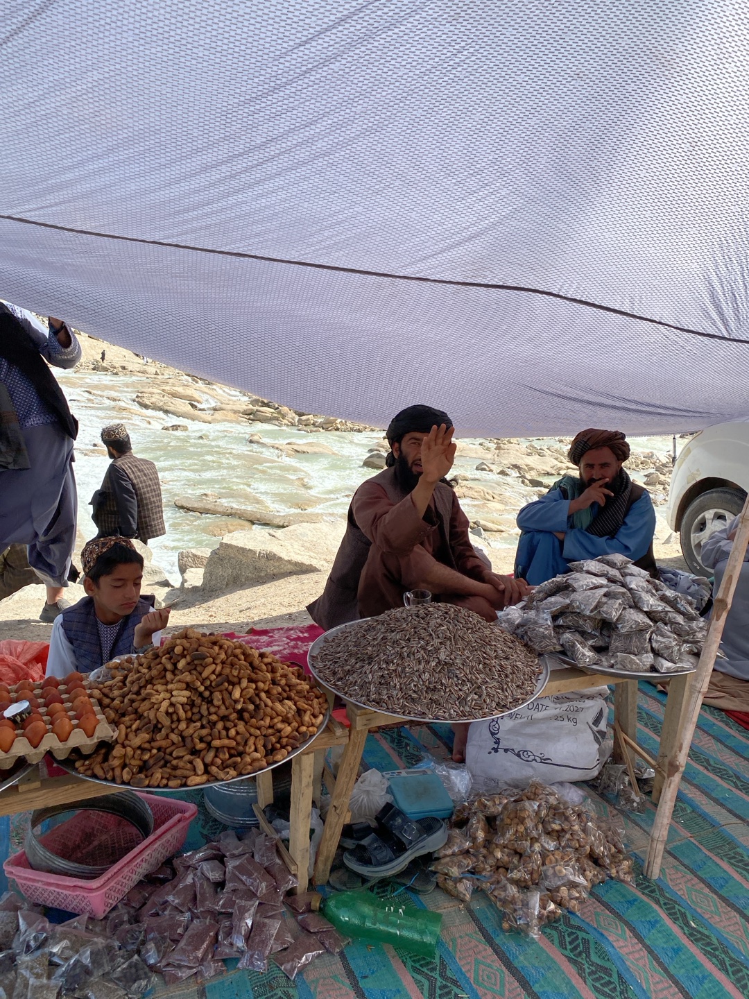 The image shows a market stall in Abdol Ahadkhan Kariz, Afghanistan, set up near a river. A white tarp provides shade. Three men are present at the stall; one is raising his hand, another is seated wi…read more