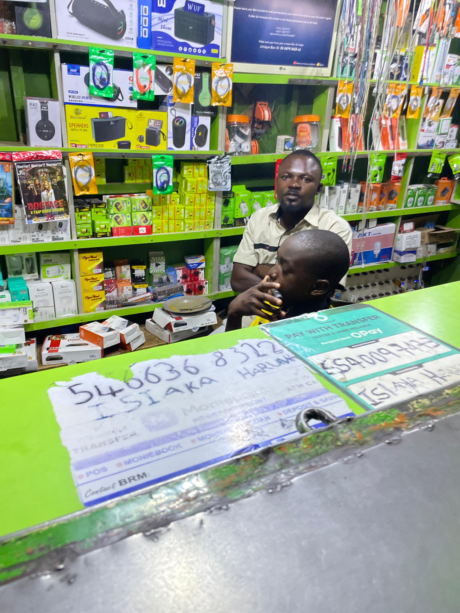 The image depicts the interior of a small retail store, likely in Jos, Nigeria, with shelves packed with electronics accessories, speakers, chargers, and batteries. Two dark-skinned men are present; o…read more
