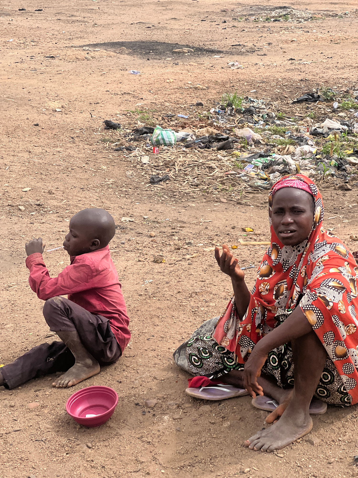 The image depicts a woman and a child in Bukuru, Nigeria. The woman, wearing a red patterned headscarf and dress, is crouched with her bare feet and sandals visible. She has a hand outstretched, as if…read more