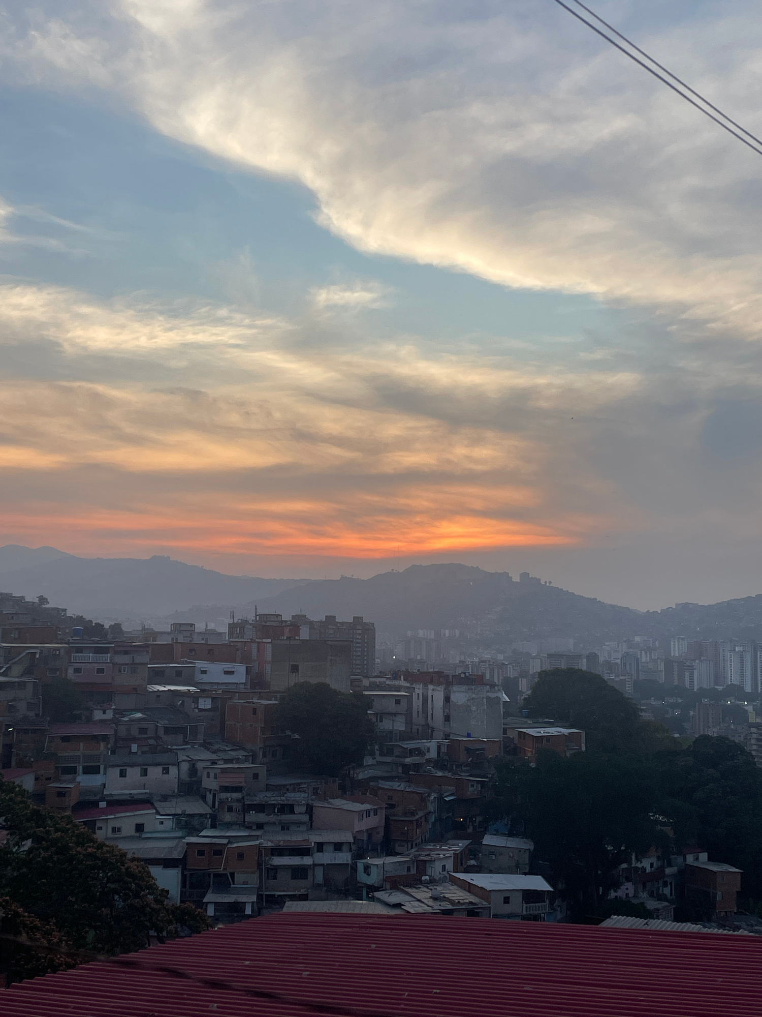 The image depicts an overview of a densely populated area, likely a favela, in Caracas, Venezuela, taken at either sunrise or sunset. **Environment**: The sky shows a gradient of light blue to a band…read more