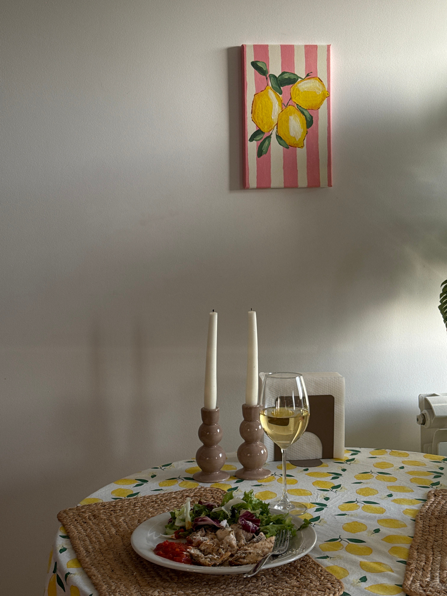 The image displays an indoor scene, likely a dining setting, with a table prepared for a meal. On a light-colored wall, a small, rectangular canvas painting is visible, featuring an artistic rendition…read more