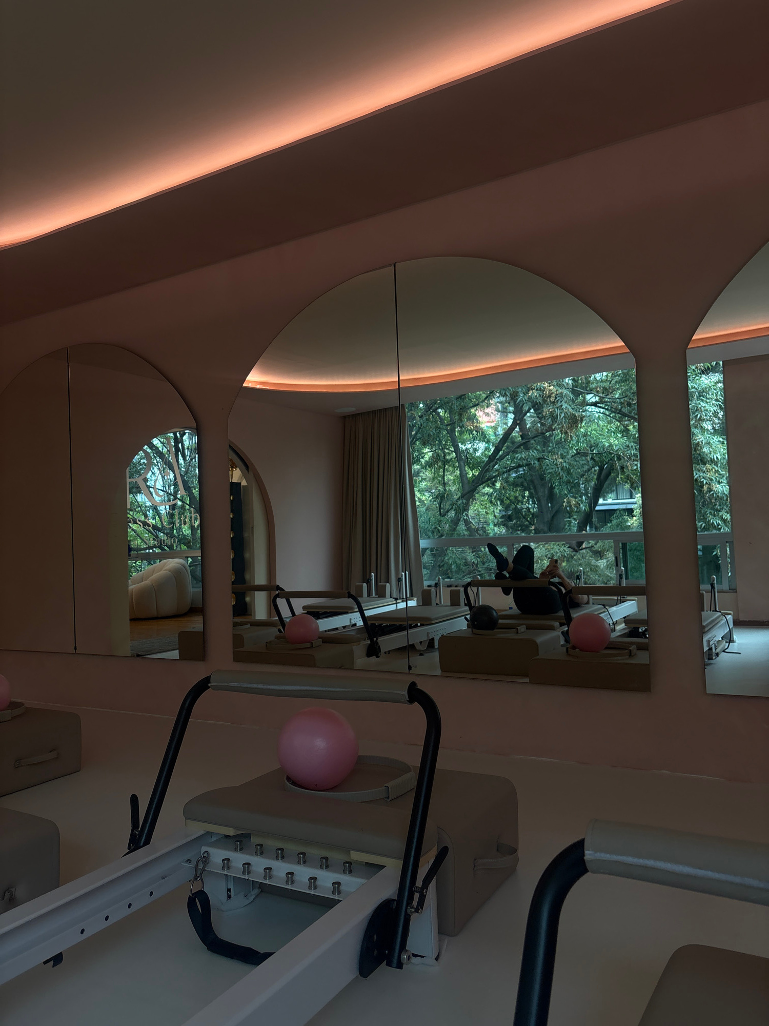 The image shows a room with a pinkish-peach tone and unique architectural design. Multiple arched mirrors reflect outdoor scenery, with trees visible through large windows. These mirrors reflect a per…read more