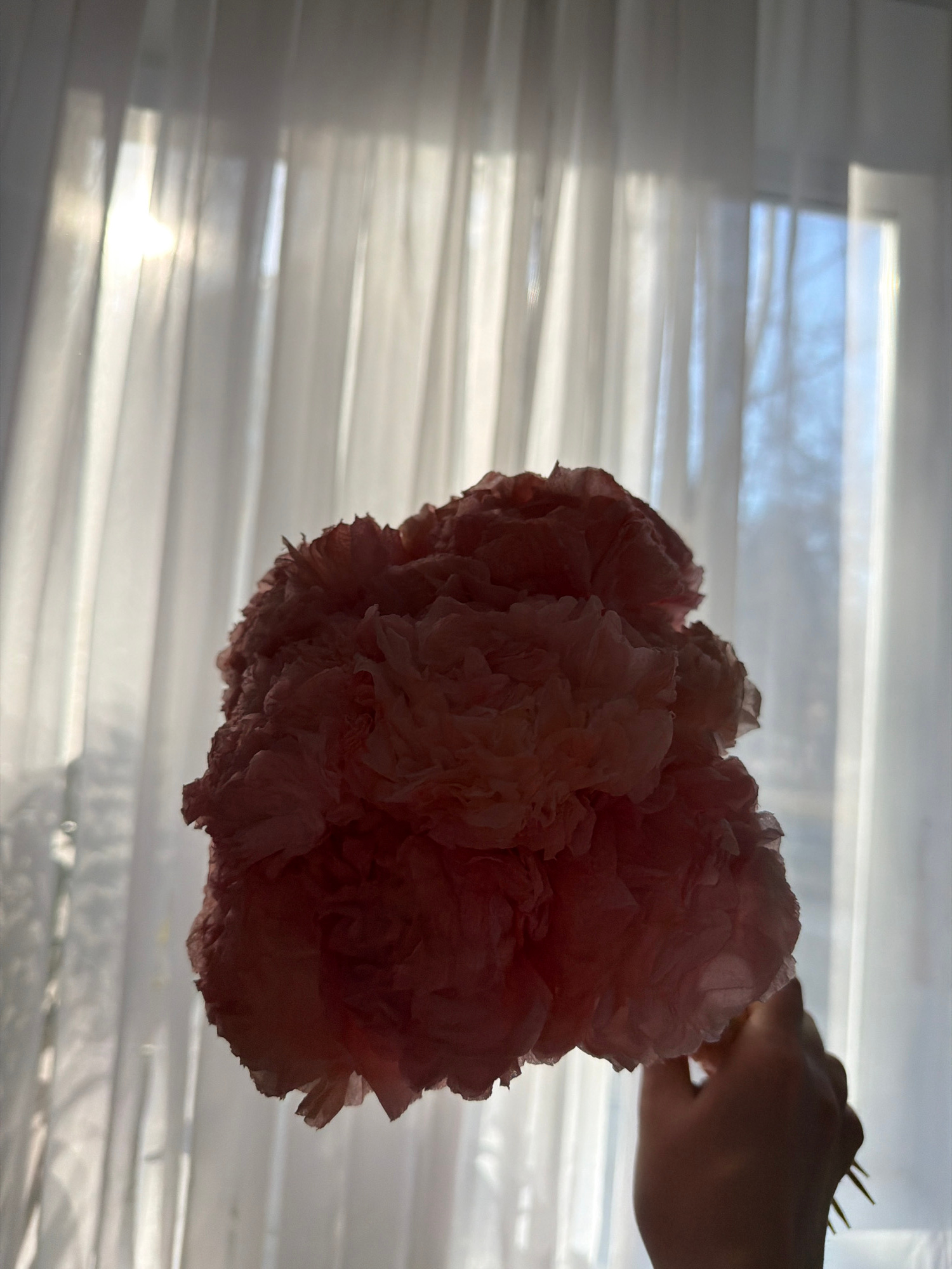 A high-angle, backlit photograph captures a delicate, ruffled pink object held by a silhouetted hand against a bright window. The object, appearing to be a decorative pom-pom or paper flower made of c…read more
