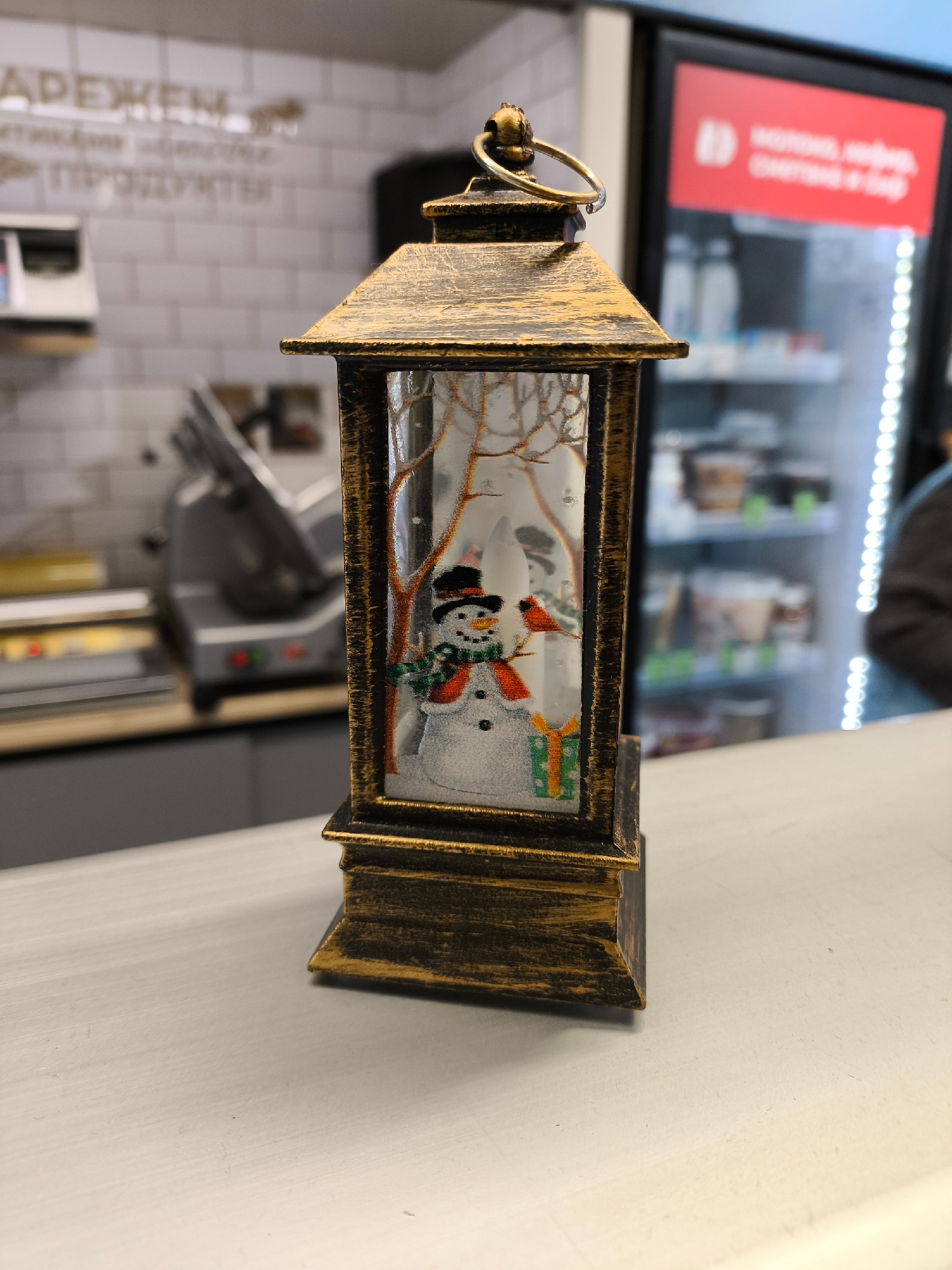 A gold-painted metal Christmas lantern is centered on a light gray countertop. Inside the lantern is a decorative scene of a snowman wearing a black top hat, a green and red scarf, and a red nose, nex…read more