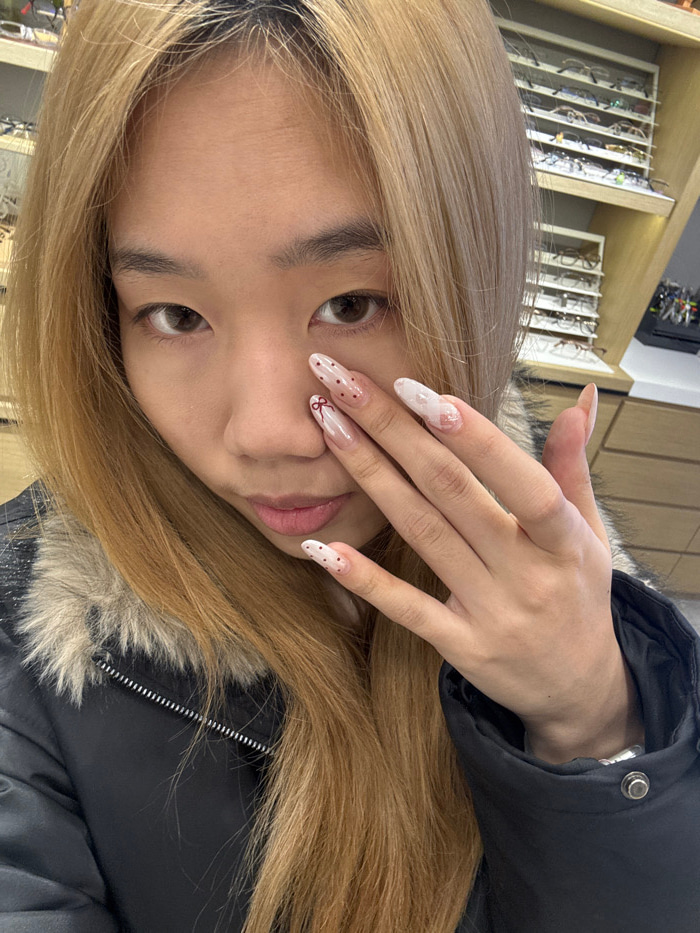 The image displays a close-up of an individual, likely female, positioned in an indoor commercial setting within Shapingba District, China. The subject has long, light brown hair with visible darker r…read more