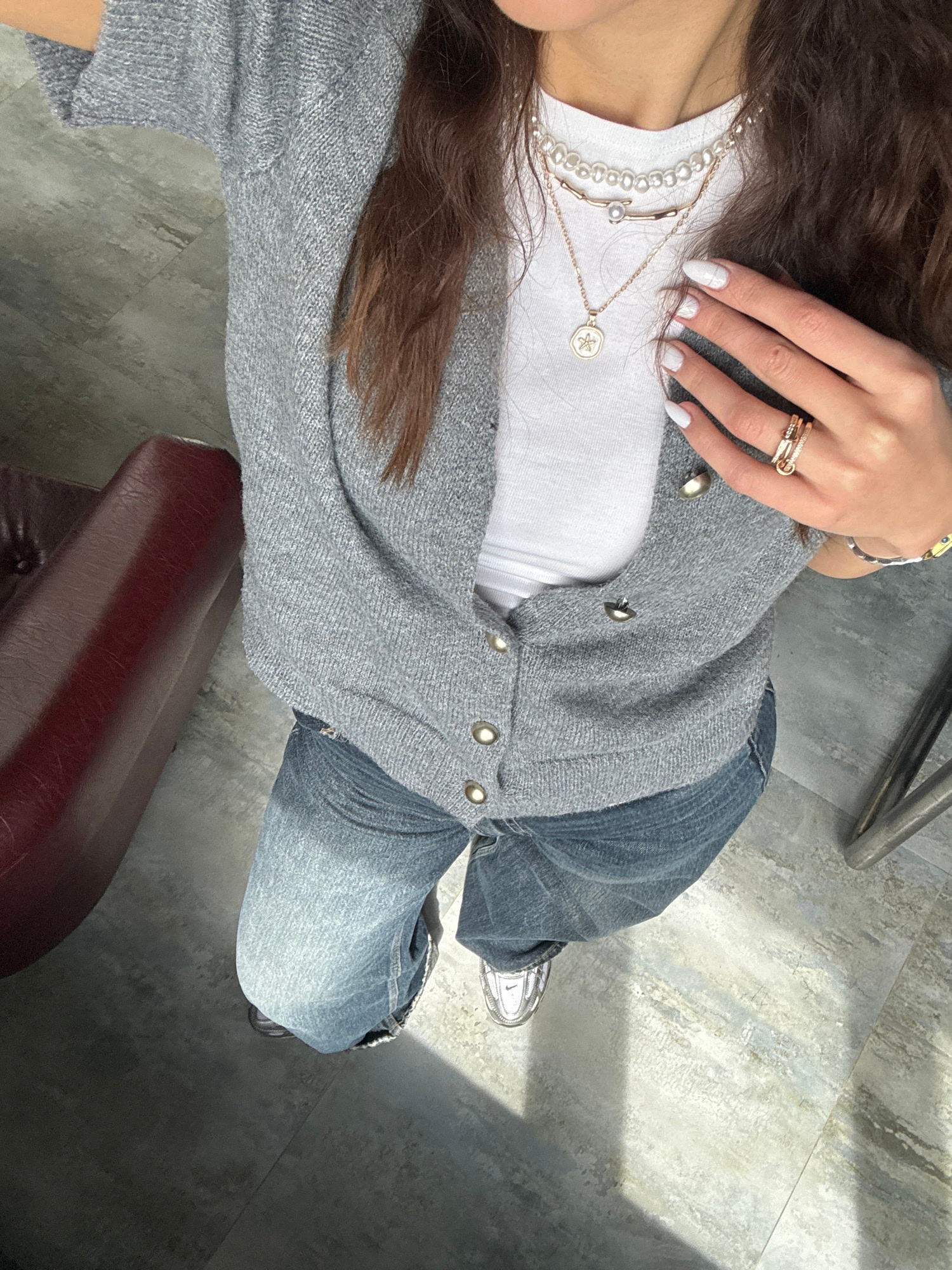 The image, taken from a top-down perspective, shows a person seated in an unknown location that is NOT in Zovuni, Armenia. The individual is wearing blue jeans, a white t-shirt, and a gray cardigan. T…read more