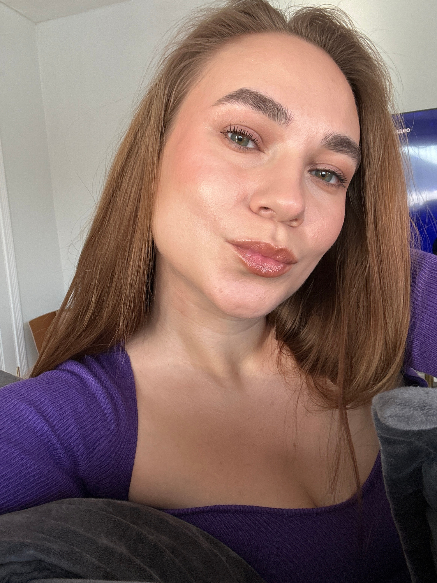 A close-up, angled selfie of a woman. She has light brown hair and green eyes. She is wearing a purple knit shirt. Part of a gray blanket is visible. The background is a white wall. The location is no…read more