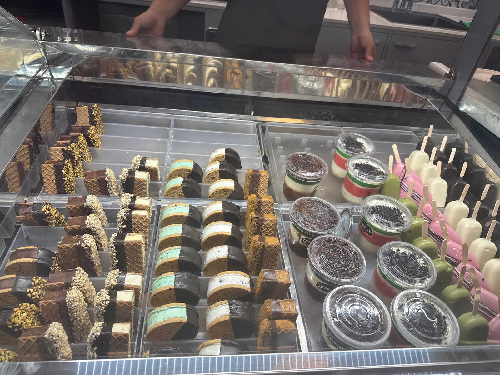 The image captures a display case in a gelato shop, showcasing a variety of frozen desserts. In the city of Naples, Florida, inside a dessert shop, a refrigerated display case contains numerous gelato…read more