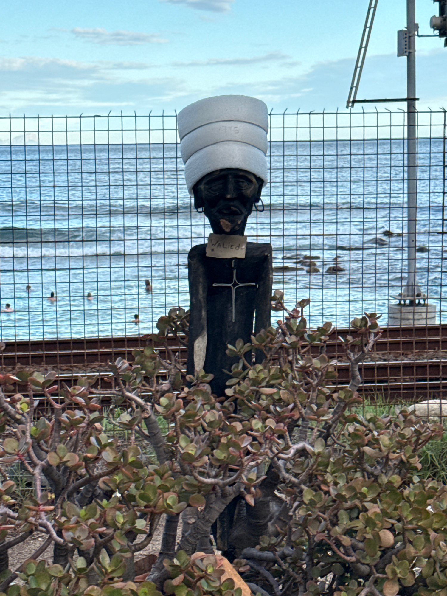 A statue stands behind a wire fence with the ocean visible in the background. The statue is dark and has a white cylindrical object on its head. A piece of paper with the word "ALLIEDS" written on itβ¦read more