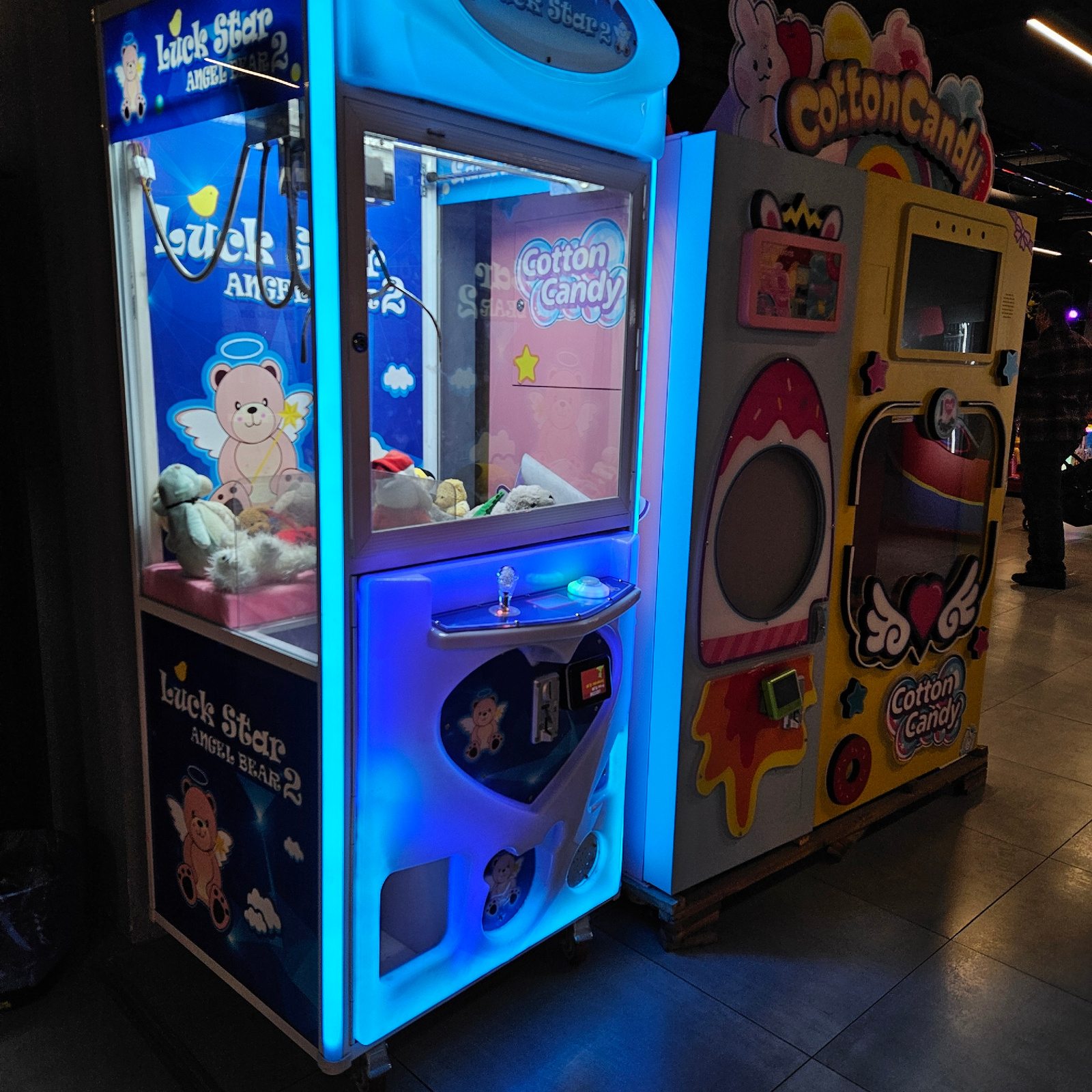 The image shows two stacked arcade claw machines. The machine on top has a yellow, pink, and gray theme with "Cotton Candy" branding and various food-related designs like donuts and strawberries. Theβ¦read more
