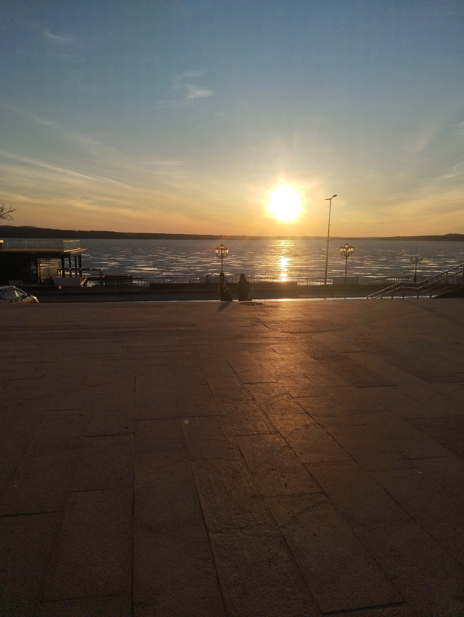 A wide-angle shot shows a paved square in Votkinsk, Russia, overlooking a body of water at sunset. The sky transitions from blue at the top to orange near the horizon, where the sun casts a bright ref…read more