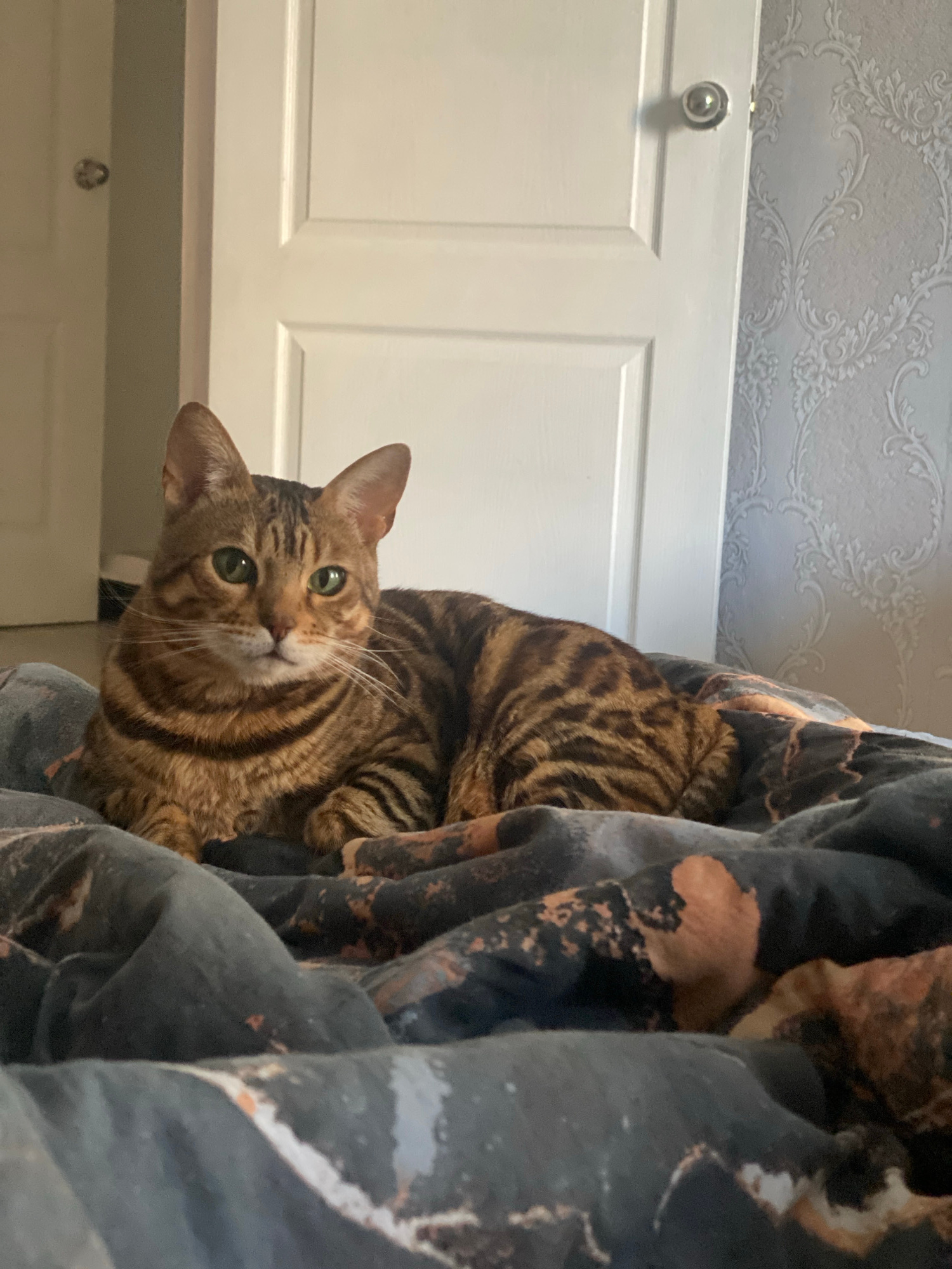 A close-up photograph depicts a brown tabby cat, seemingly nestled in dark-colored, tie-dye patterned fabric, likely a blanket or clothing. The cat has green eyes and faces towards the camera. In the…read more