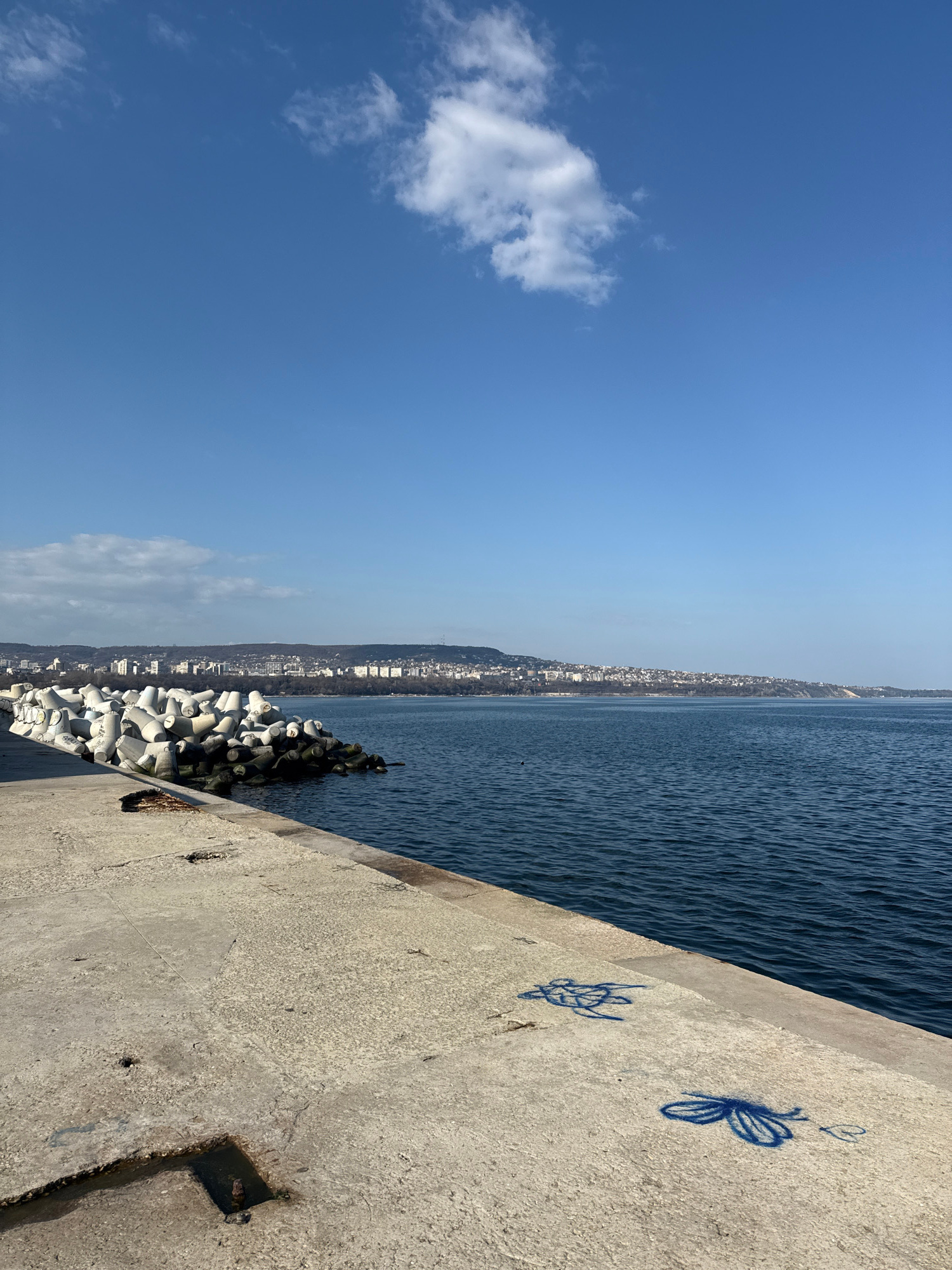 The image shows a section of the Varna, Bulgaria coastline. The foreground consists of a concrete pier or seawall with blue graffiti of insects. To the left of the pier is the Black Sea and a city sky…read more