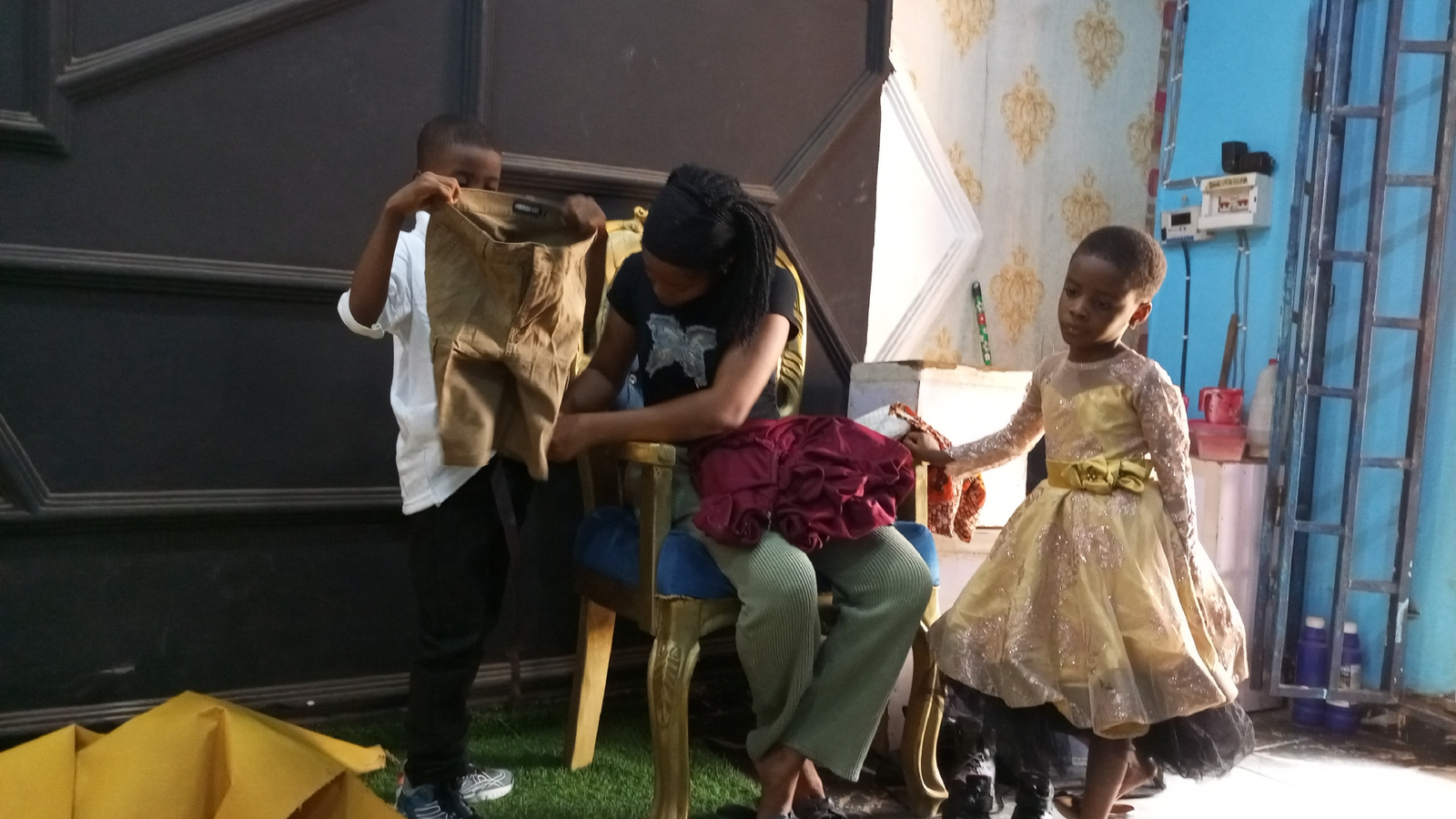 A woman sits in a gold-painted, blue-cushioned chair in what appears to be a staged or makeshift studio setting in Sabon Tasha, Nigeria. She wears a black t-shirt with a butterfly graphic, green pants…read more