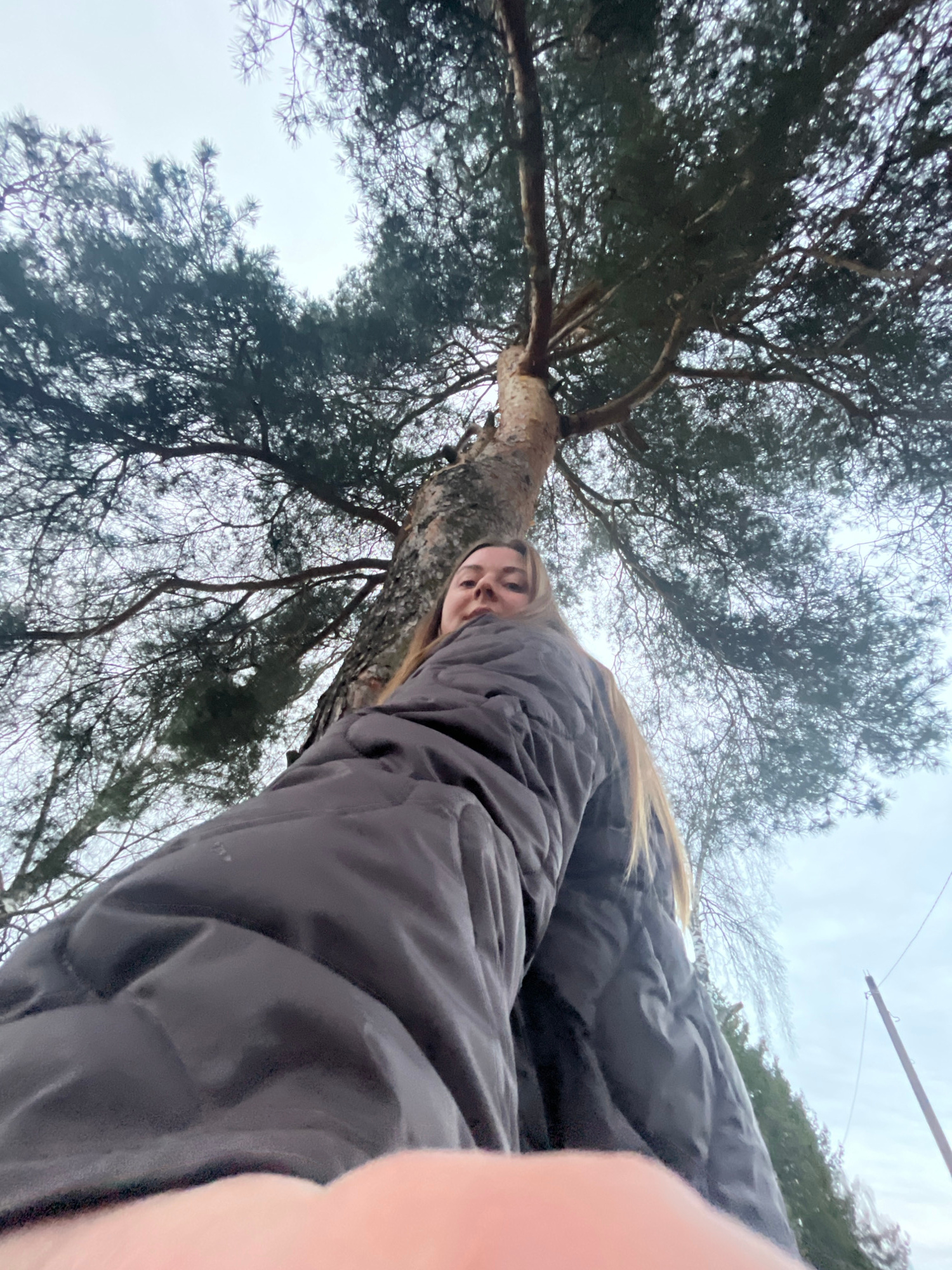 A person is standing beneath a large tree in what appears to be a forested area. The tree has thick, dark foliage and many branches reaching towards the overcast sky. The person is wearing a dark-colo…read more