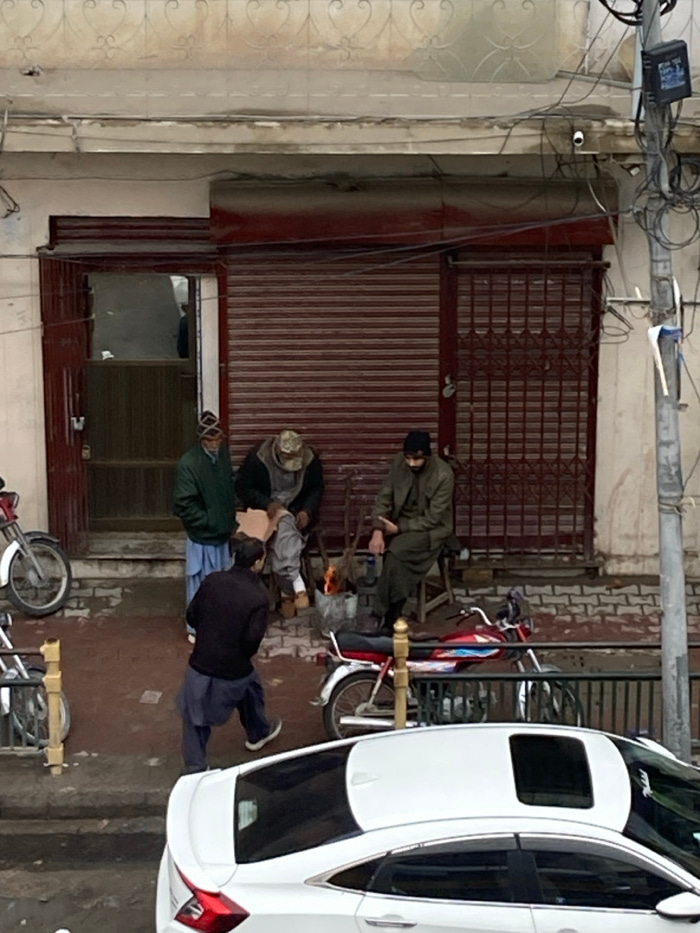 The image displays an urban street scene in Quetta City Tehsil, Pakistan. Four adult males are present on a sidewalk in front of a building with two ground-level shopfronts. One shop is partially open…read more