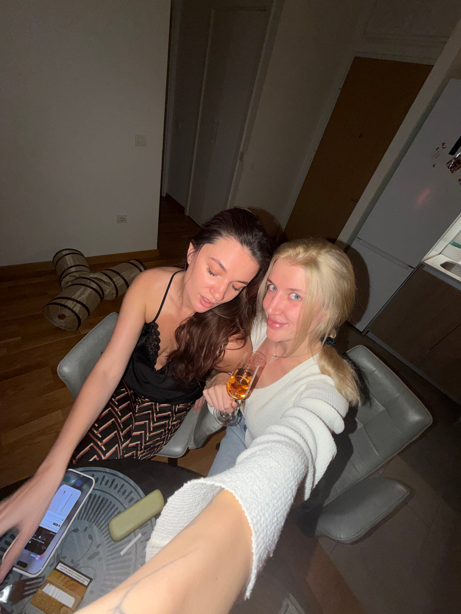 Two women pose for a selfie. One woman, with long blonde hair, wears a white sweater and holds a wine glass. The other woman, with long brown hair, wears a black top with lace and patterned pants. The…read more