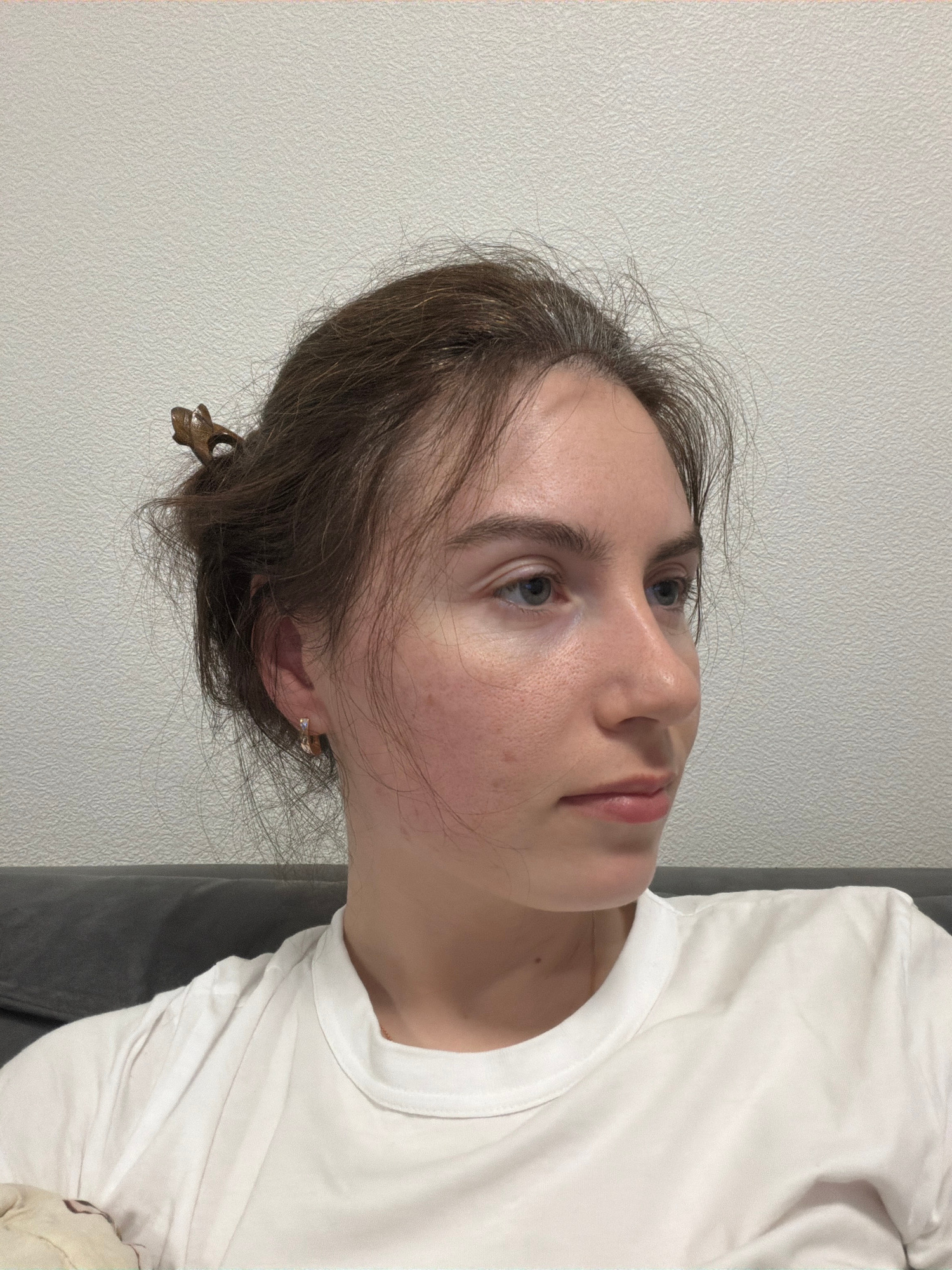 A woman with fair skin, blue eyes, and brown hair pulled back is positioned against a light grey wall. She is wearing a white t-shirt. A small, decorative hair clip is visible in her hair. Her gaze is…read more