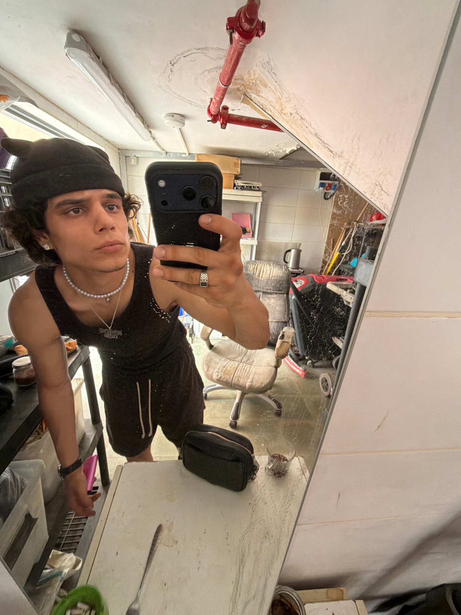 A young man takes a selfie in front of a large mirror, holding a black smartphone with his right hand. He wears a black beanie, a dark tank top, a white pearl necklace, and a silver ring with a dark sā¦read more