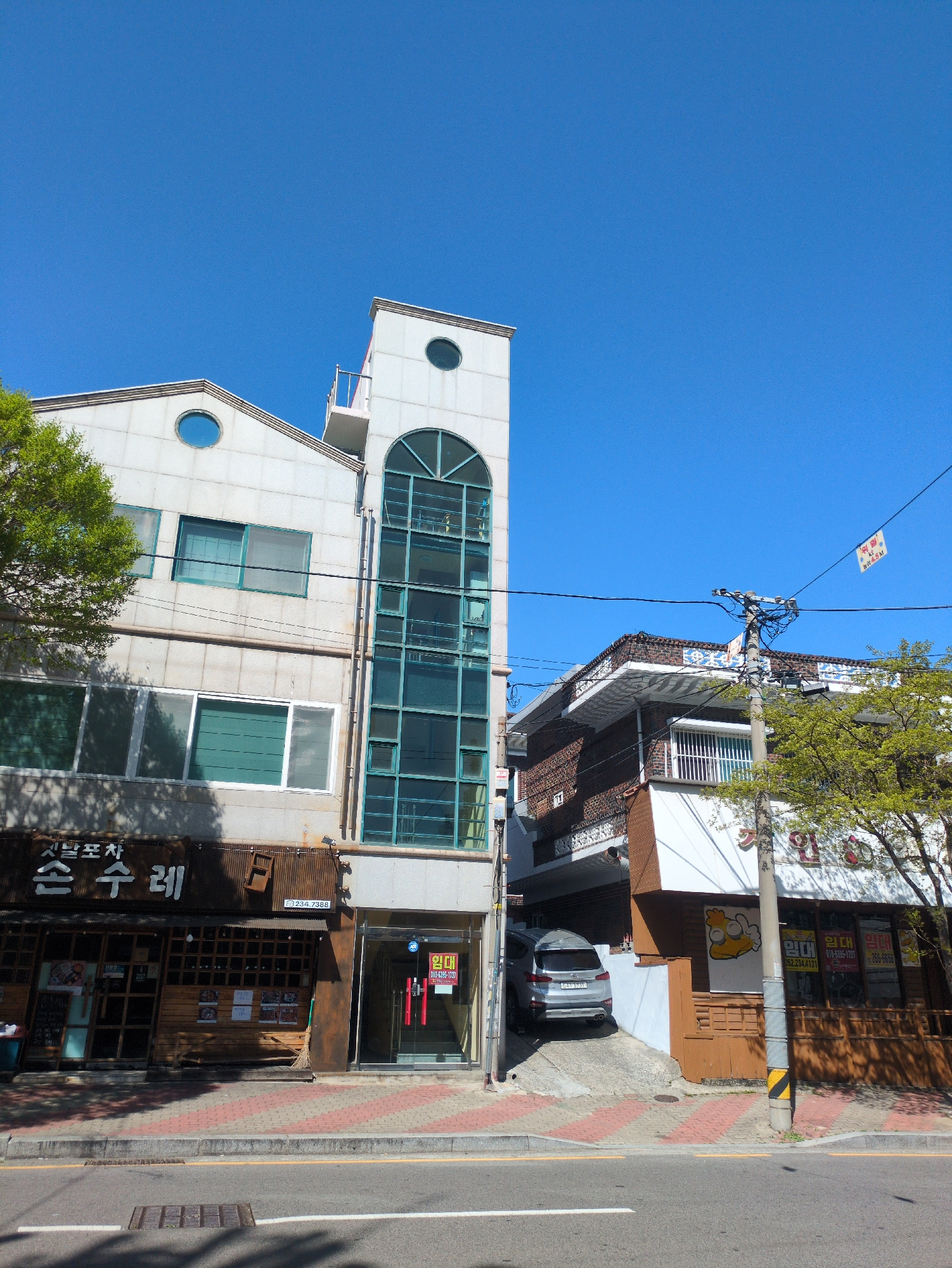 The image depicts a building in Ulsan, South Korea on a sunny day. The building has a unique architectural design with a tall, narrow section topped by a semi-circular window. There are also circular windows on other parts of the building. The building is painted in light colors. A glass facade with steel accents is visible. To the right of the building, there is a street with a sidewalk. A business with wood trim and a sign in Korean is also seen. A car is parked in front of the building. Overhead power lines are visible. The sky is a clear blue. | Open Wire