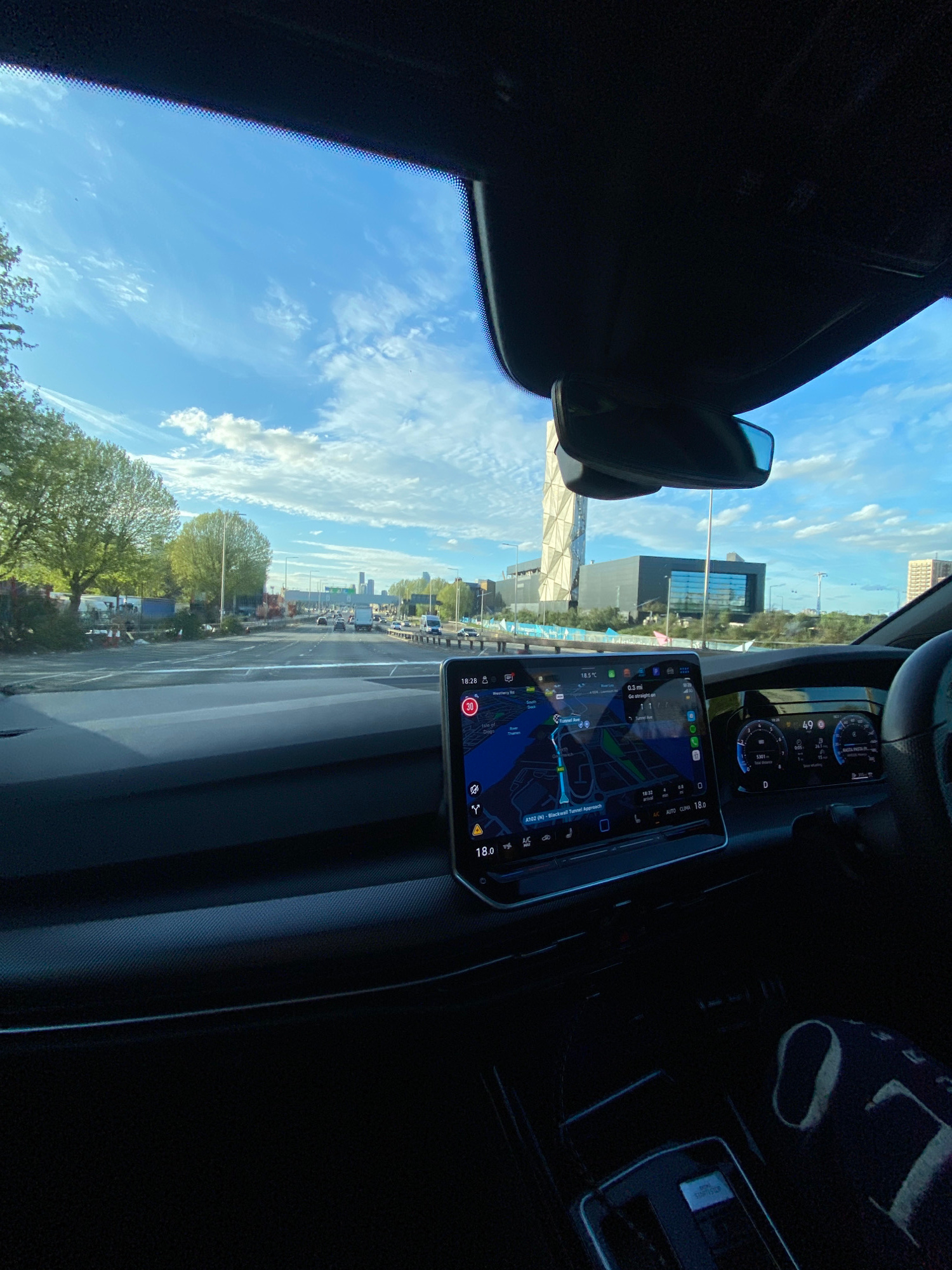 The image depicts a vehicle interior with an external view through the windshield. The interior includes the dashboard with a digital display showing a navigation system and driving parameters. The na…read more