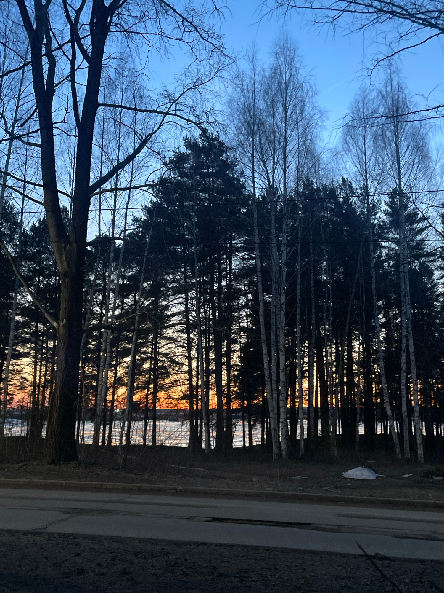 The image captures a scene in Chaikovsky, Russia, at dusk or dawn. A dense row of dark, tall trees lines the edge of what appears to be a road or path. The trees consist of bare birch trees and dark e…read more