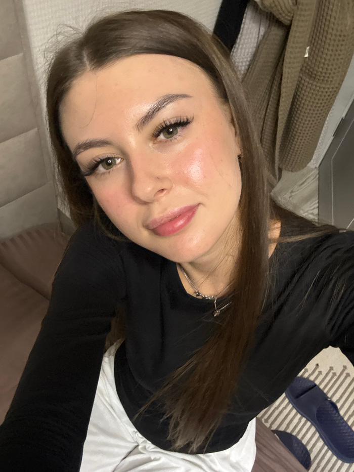 This image depicts a single female subject within an indoor residential setting, located in the city of Dubovaya, Russia. The subject, an adult female with long, straight brown hair parted in the midd…read more