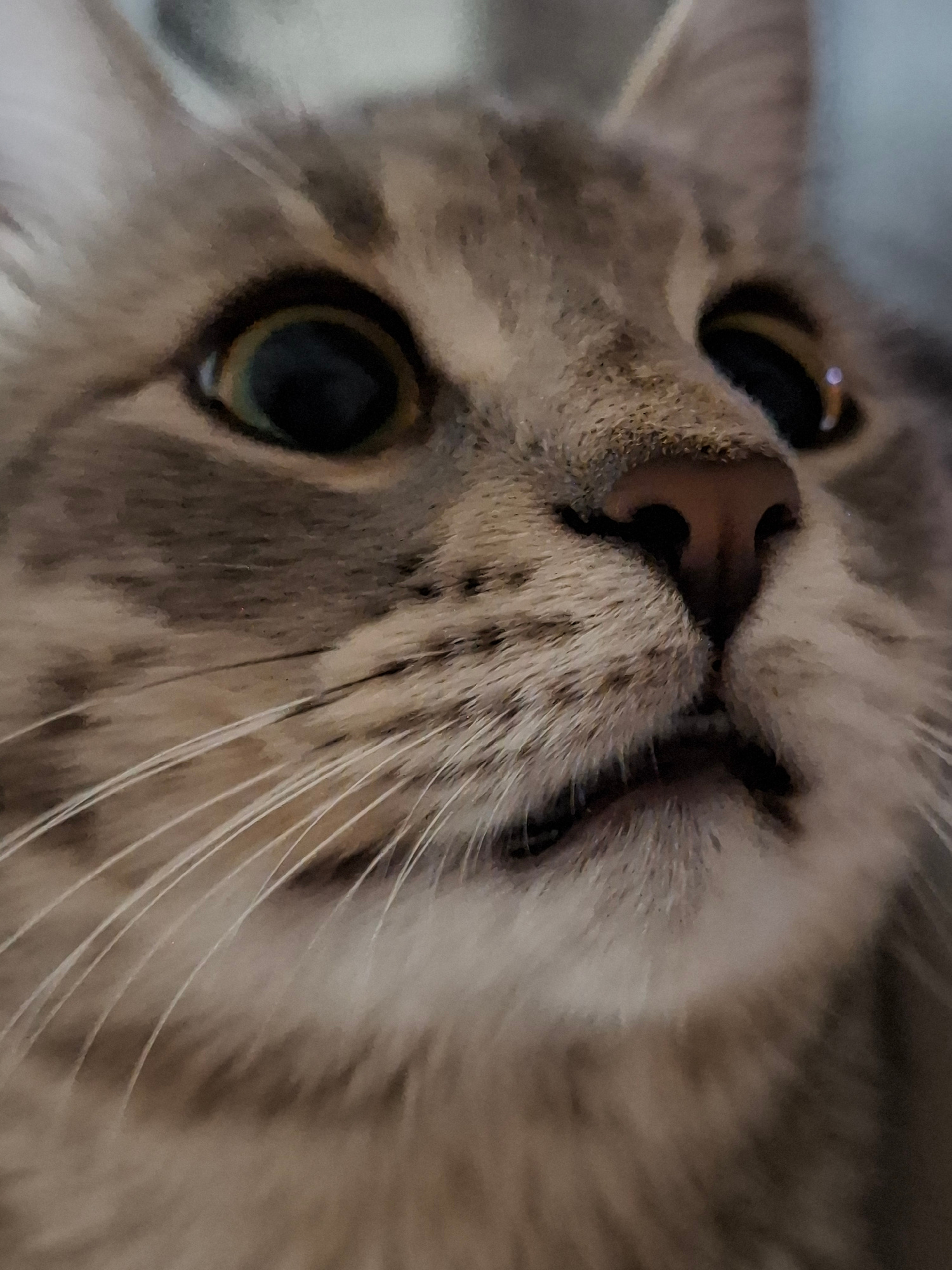 The image presents a close-up, diagonal portrait of a domestic cat's face. The cat features tabby fur in shades of grey, brown, and cream, with distinct stripes and patterns visible across its foreheaβ¦read more