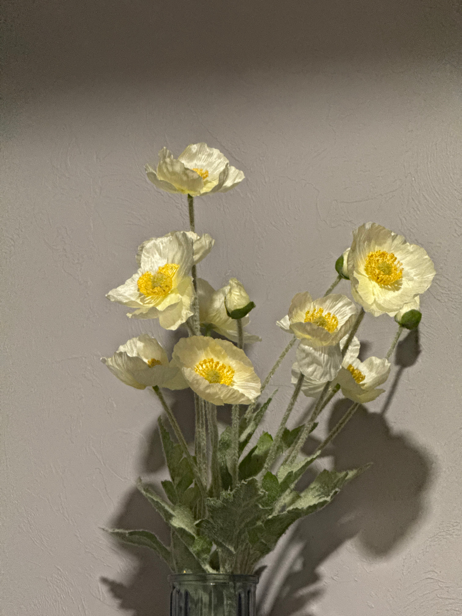 The image presents a bouquet of artificial flowers, likely made of fabric, with white petals and yellow centers, positioned against a textured, light-gray wall. The flowers are arranged in a transpare…read more