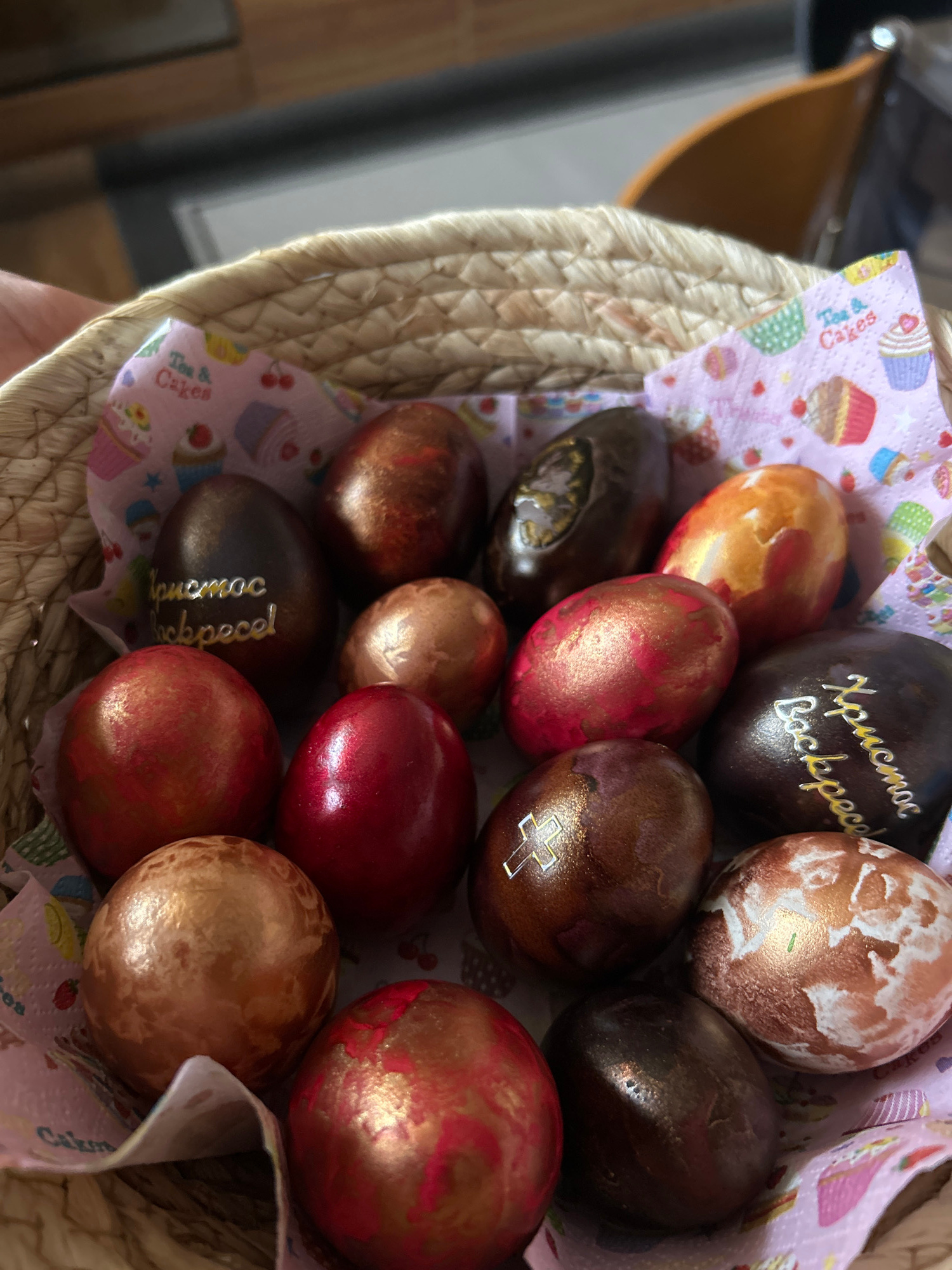A close-up shot depicts a woven basket filled with decorated Easter eggs. The eggs are dyed in various colors, including shades of red, brown, and bronze, with some adorned with gold accents, crosses,…read more