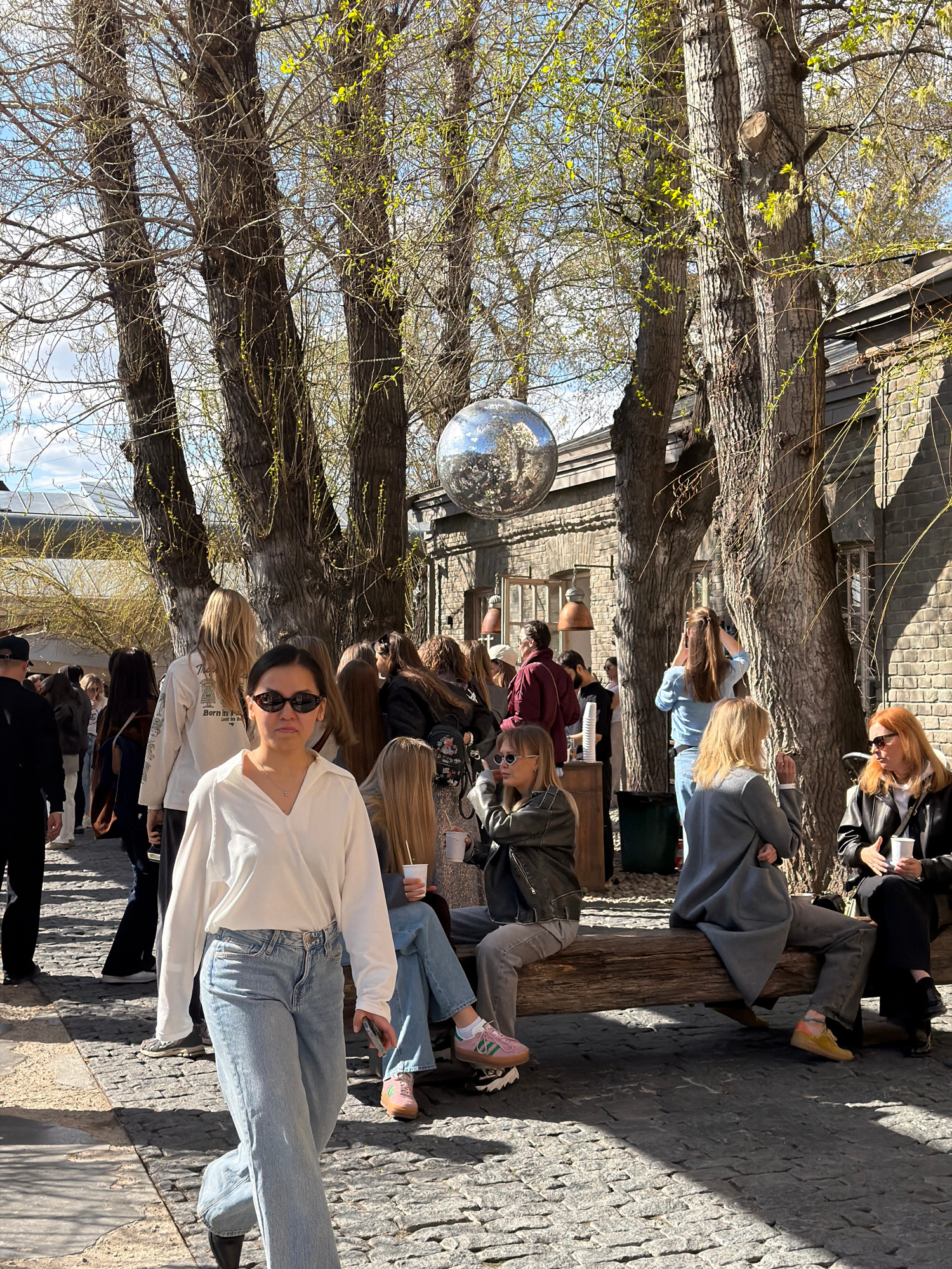 A row of people sit along a wooden beam, with trees overhead and a silver disco ball hanging among the branches. The seated individuals wear casual clothing. The flooring appears to be paved with unev…read more