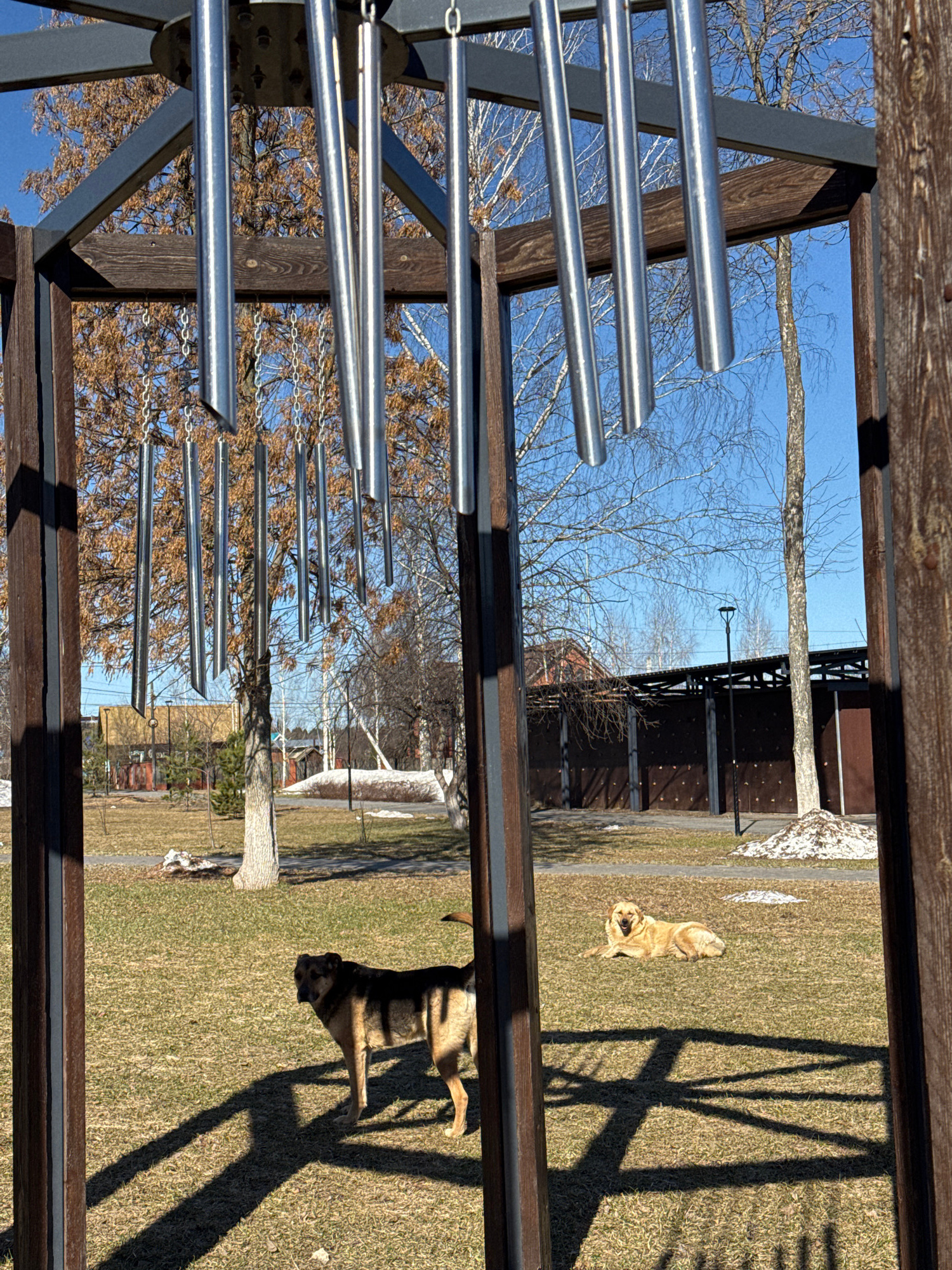 The scene is an outdoor area with grass and trees. A metal musical instrument is in the foreground, appearing to be part of a playground or park structure. Two dogs are present: one is lying down, and…read more