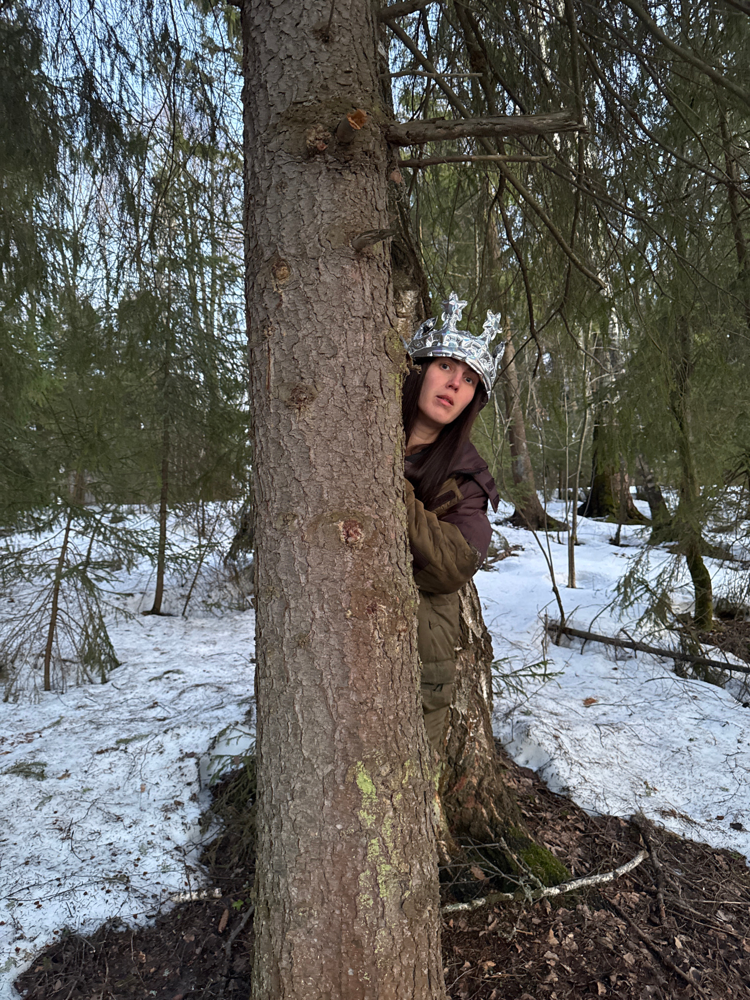 The image shows a person wearing a shiny, silver crown, lying on a fallen tree trunk in a snowy wooded area. The person has dark hair and is wearing a brown jacket and green pants. The ground is partiβ¦read more