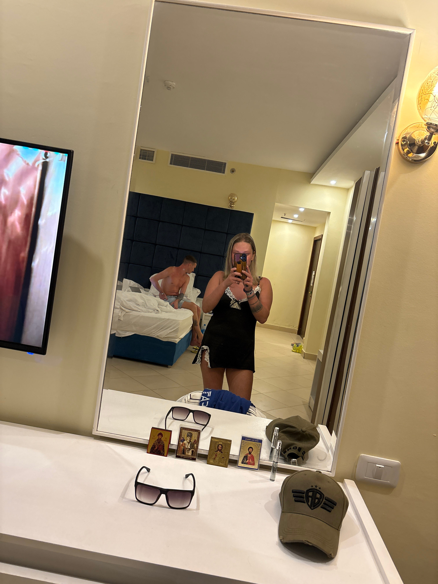 The image depicts a mirror selfie taken in a room, likely a hotel room, in an unknown location in Egypt. A woman with blonde hair is visible holding a smartphone up to take the photo, and her reflecti…read more