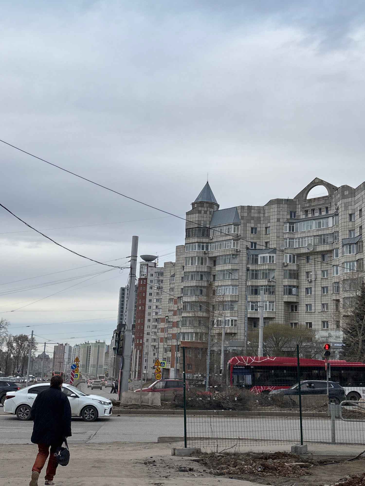 The image shows a street scene in Perm, Russia. In the foreground, a person wearing a dark coat, reddish-brown pants, and light-colored boots is walking along the sidewalk. The sidewalk is adjacent to…read more