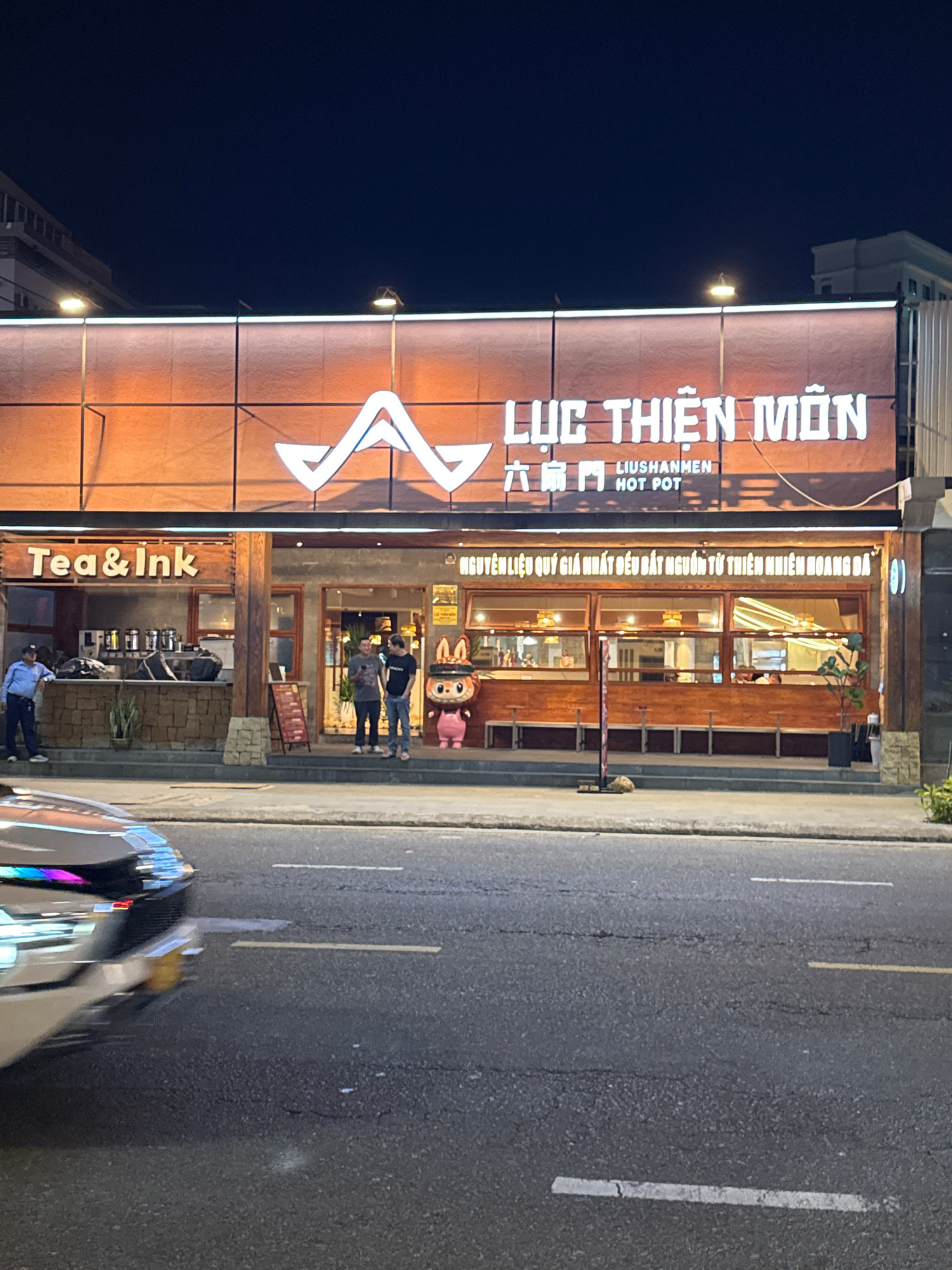 This image depicts the facade of a restaurant and cafe in Đà Nẵng, Vietnam, called "Tea & Ink" and "Lục Thiện Môn," (Liushanmen Hot Pot). The restaurant's sign is in Vietnamese and Mandarin Chinese. S…read more